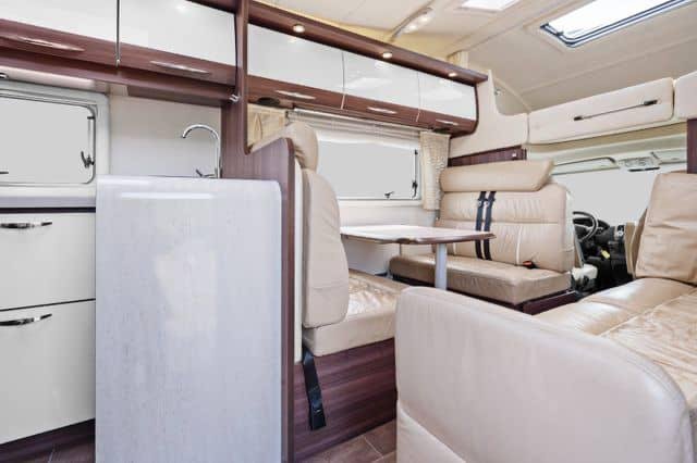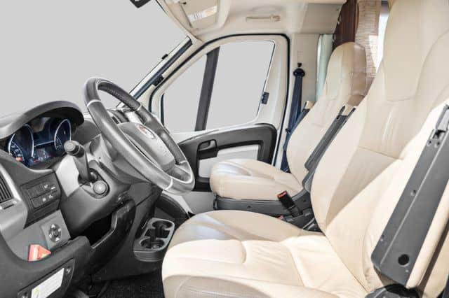 Grand salon en cuir spacieux avec de la place pour toute la famille autour de la table. Grand lit double à l’arrière du camping-car avec possibilité de le refermer.