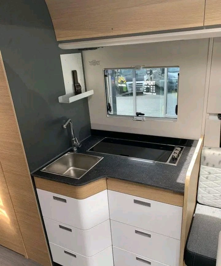À l’avant de la voiture se trouve un lit électrique escamotable qui peut être facilement abaissé lorsque 3 ou 4 personnes voyagent. Il est prêt à être utilisé à tout moment et se range au-dessus de la cabine.