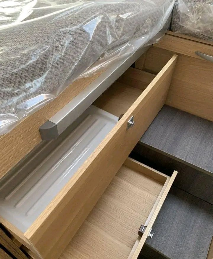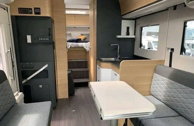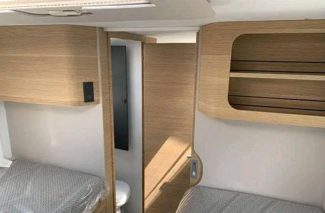 Tout au fond du véhicule se trouvent deux lits simples qui peuvent être transformés en un grand lit double d’un simple geste. Sous le lit, un ingénieux placard permet de ranger les vêtements.
