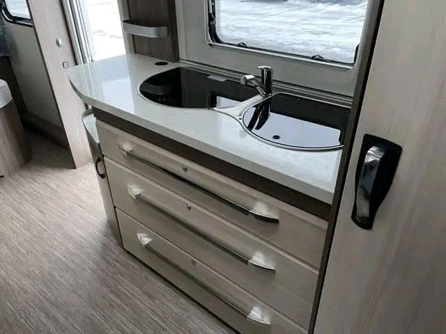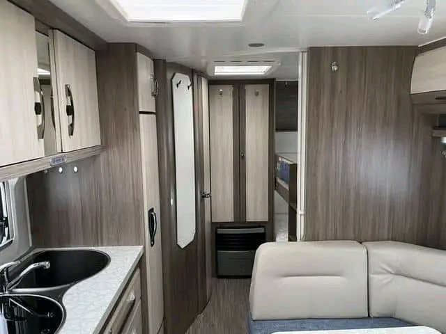 La première chose que l’on voit en entrant dans la caravane, c’est un coin salon confortable avec des détails en tissu. C’est un endroit idéal pour s’asseoir et toute la famille peut profiter d’un bon repas ou d’une soirée jeux. Les armoires murales offrent beaucoup d’espace de rangement. Il peut facilement être converti en espace de couchage supplémentaire si nécessaire.