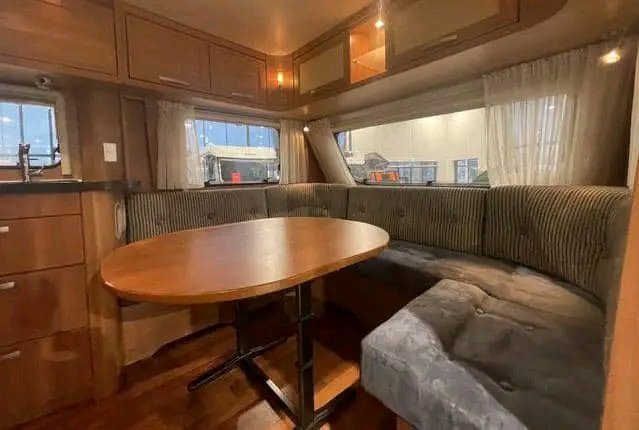 Le coin salon offre un bon confort d’assise. La grande table permet d’inviter facilement des amis à manger dans la caravane.