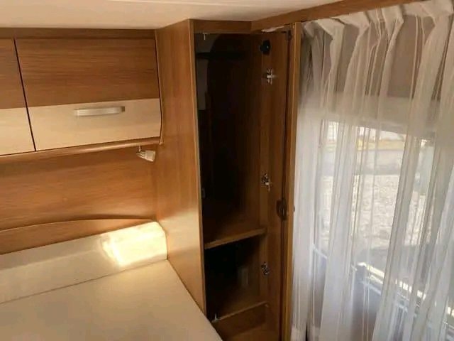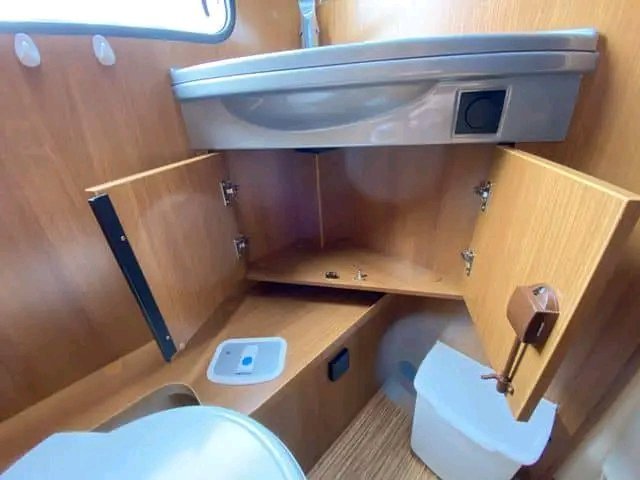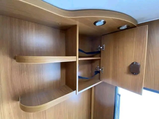 Ce modèle dispose d’un grand lit double placé au centre. En même temps, il y a un rideau qui peut être facilement masqué pour séparer les toilettes et la zone de couchage. De nombreux placards permettent de ranger tout ce dont vous avez besoin. Placards suspendus de part et d’autre du lit.