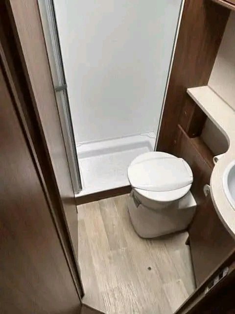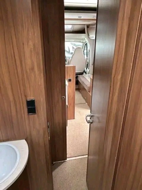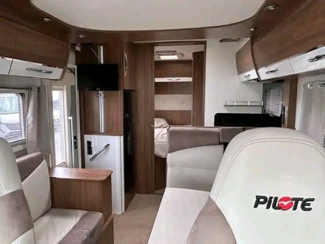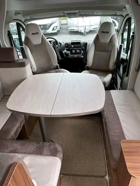 Belle solution avec lit double latéral et salle de bain à l’arrière, lit abaissable électriquement à l’avant (qui ne bloque pas la porte), grand salon avec banquette latérale et fauteuils avant pivotants, porte coulissante vers la chambre, table basse coulissante avec abattant, etc….