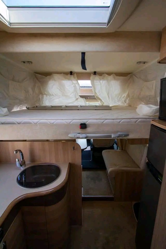 La chambre à coucher se trouve à l’arrière du camping-car, où il y a un grand lit positionné au centre avec accès des deux côtés. Il y a beaucoup d’espace de rangement dans les tiroirs et les placards au-dessus, au-dessous et sur le côté du lit. Il y a une table de chevet de chaque côté du lit.