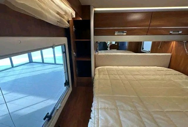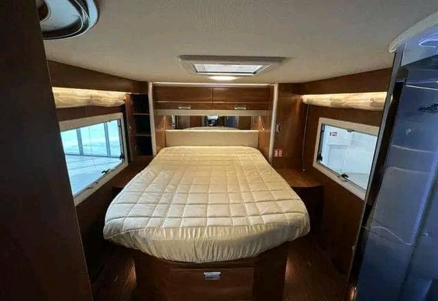 À l’arrière du camping-car, il y a un grand lit queen-size au centre.