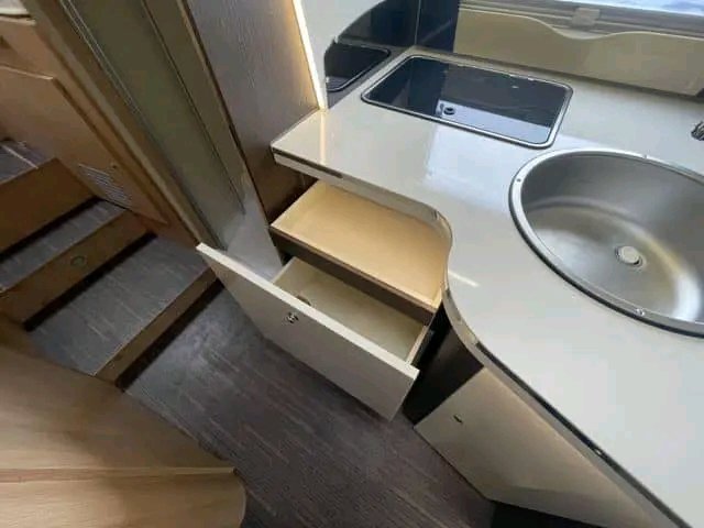 Salon en forme de L avec des chaises réversibles dans la cabine. Nombreuses places assises pour 5 personnes. Grande table pouvant être déplacée dans toutes les directions. Lit escamotable pouvant accueillir deux personnes. La table peut également être abaissée pour créer un lit d’urgence pour une personne supplémentaire.