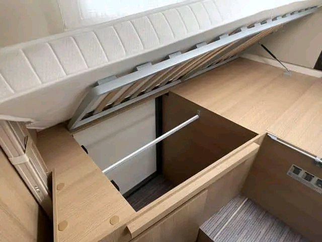 Nombreux placards, liseuse LED de part et d’autre du lit. Etagère de rangement pour livres, lunettes ou téléphones de chaque côté de l’unité murale.