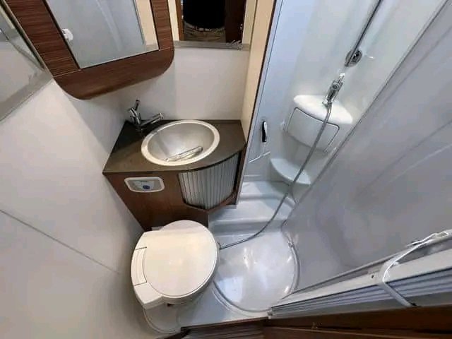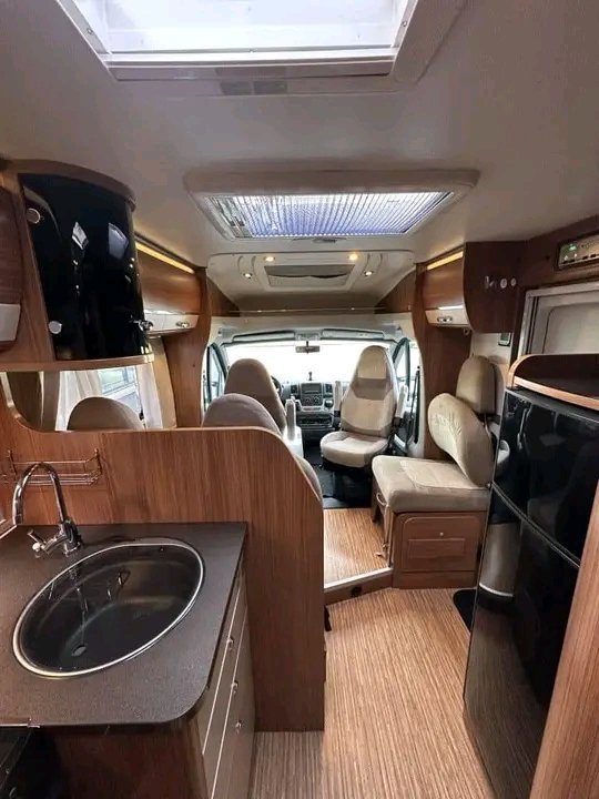 A l’avant du camping-car, vous trouverez une grande salle de bains avec sa propre douche et la possibilité d’éteindre le reste de l’unité. La cuisine est équipée d’un grand réfrigérateur et de nombreux rangements dans les tiroirs et les placards. Les sièges du conducteur et du passager peuvent être rabattus pour former un groupe de sièges.