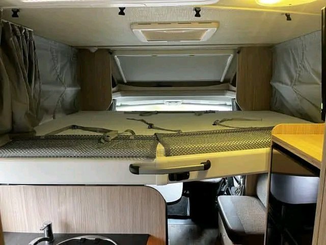Ce camping-car offre une solution très appréciée pour les lits simples en hauteur, avec la possibilité de tirer le centre pour créer un grand lit double à l’arrière du véhicule. A l’avant, il y a un lit escamotable qui peut facilement être abaissé au-dessus de la zone de sièges en cas de besoin.