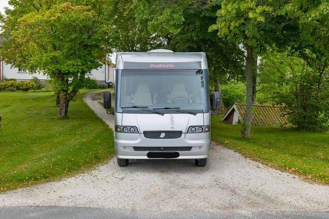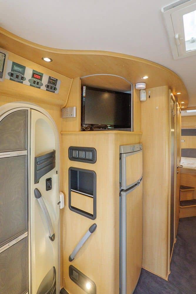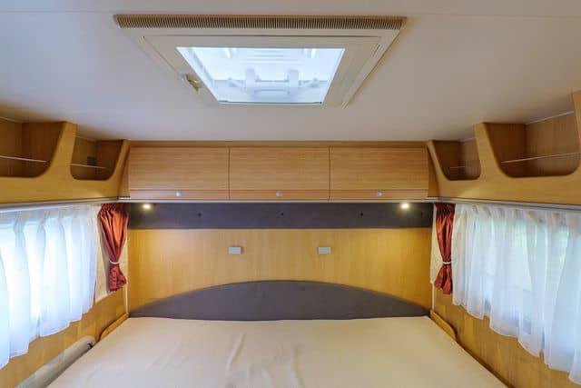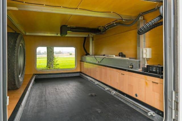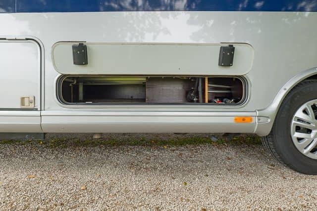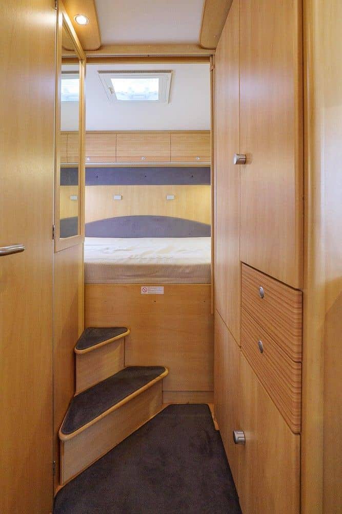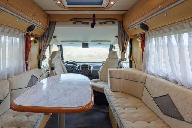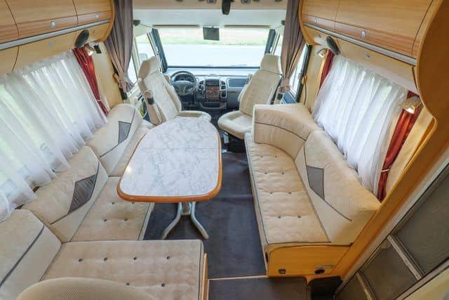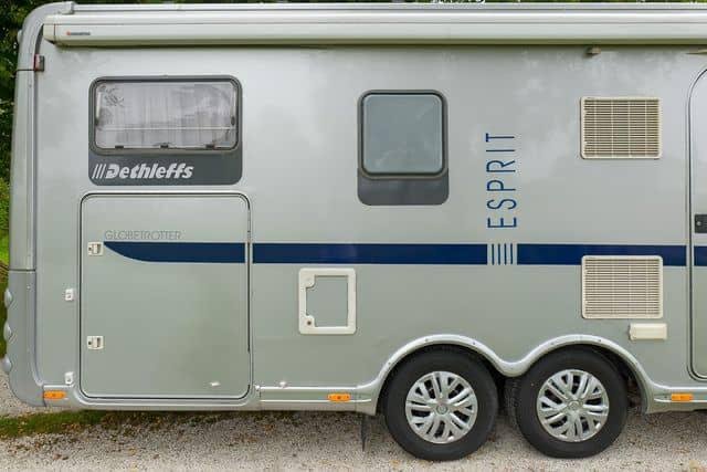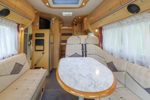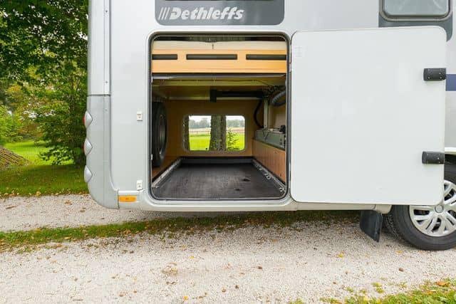 Grande voiture familiale de Dethleffs, avec beaucoup d’espace de rangement et un grand garage.