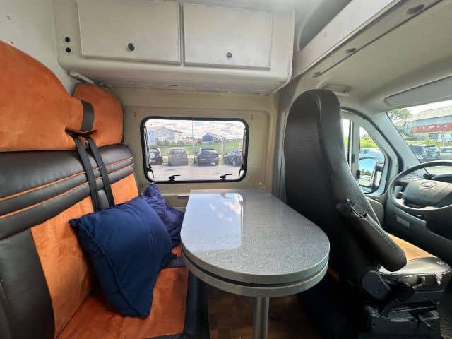 Salon spacieux, fauteuils de pilotage réversibles et trappe de toit.