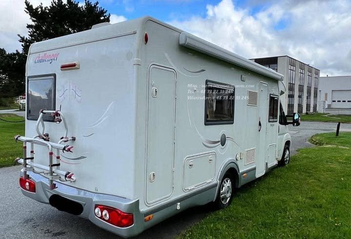 Challenger Mageo 116 sur châssis Fiat Ducato, implantation très recherchée avec lit double et salle de bain à l’arrière.