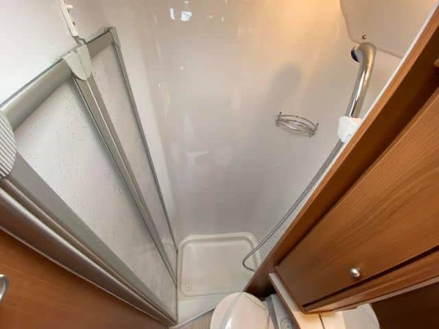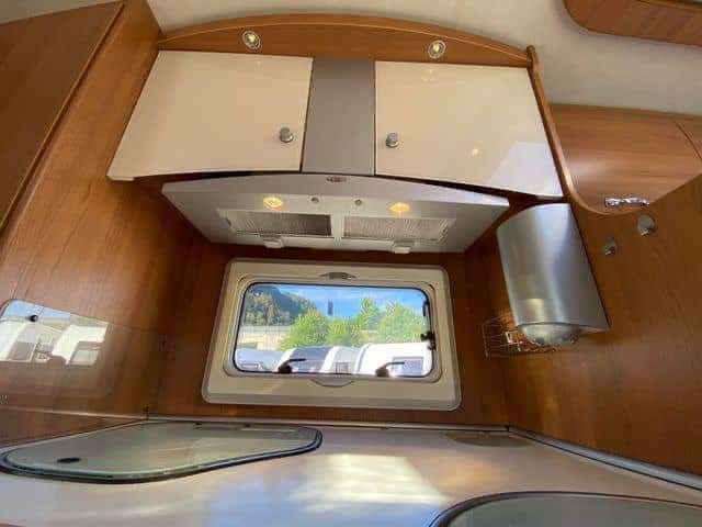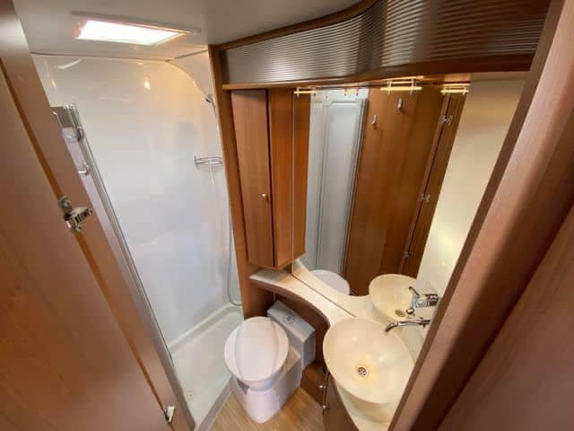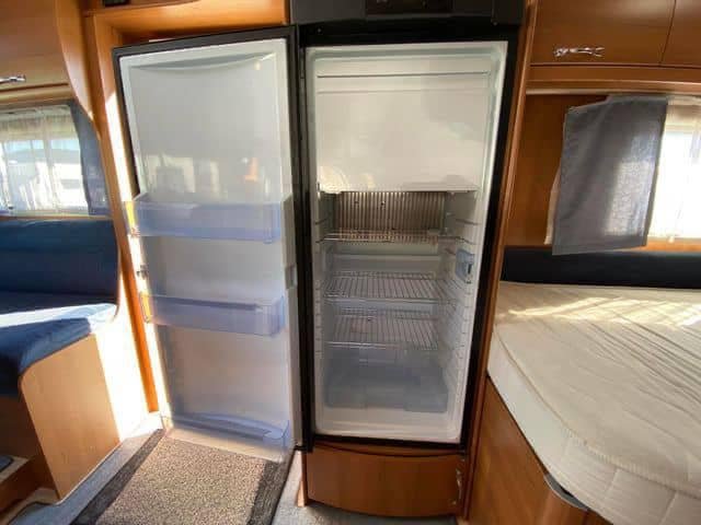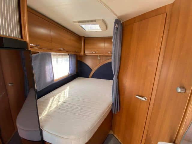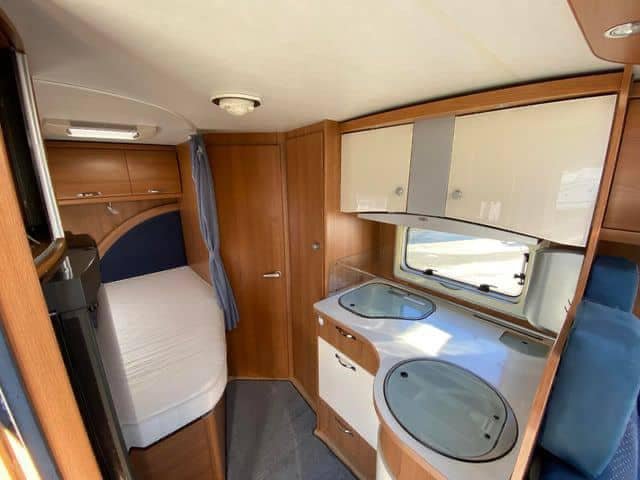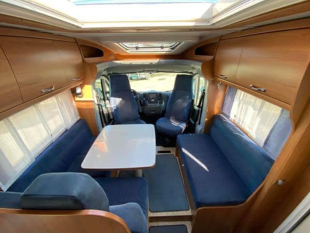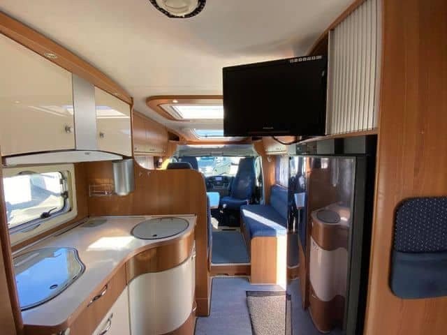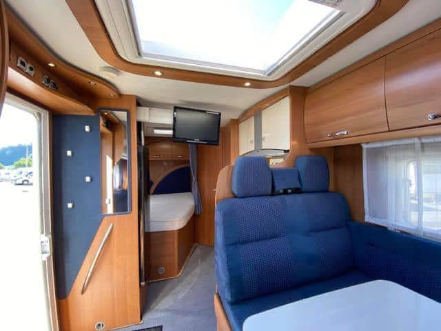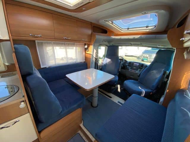Grande et attrayante salle de séjour à l’avant, avec deux fauteuils pilotes qui peuvent être retournés. Une grande lucarne apporte beaucoup de lumière et le coin salon peut facilement accueillir 6 personnes. Le coin salon peut être surélevé pour créer deux couchettes supplémentaires. Au centre se trouve une cuisine pratique avec beaucoup d’espace de travail et de possibilités de rangement. De l’autre côté, il y a un grand réfrigérateur avec congélateur et une télévision montée dans le placard au-dessus. À l’arrière se trouve une salle de bains pratique avec une salle de douche attenante aux murs massifs. A côté de la salle de bain se trouve un grand lit double avec de nombreux rangements en dessous.