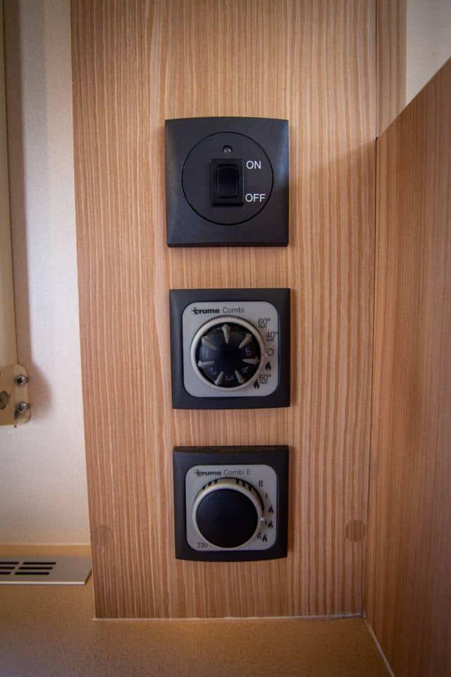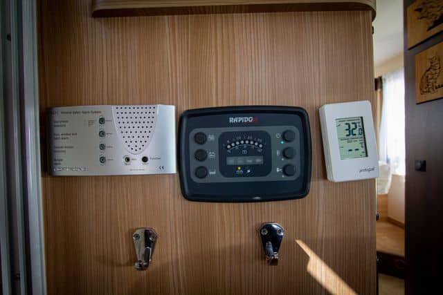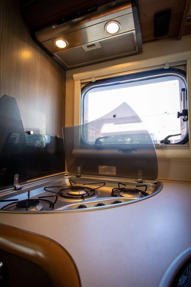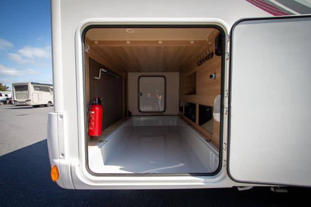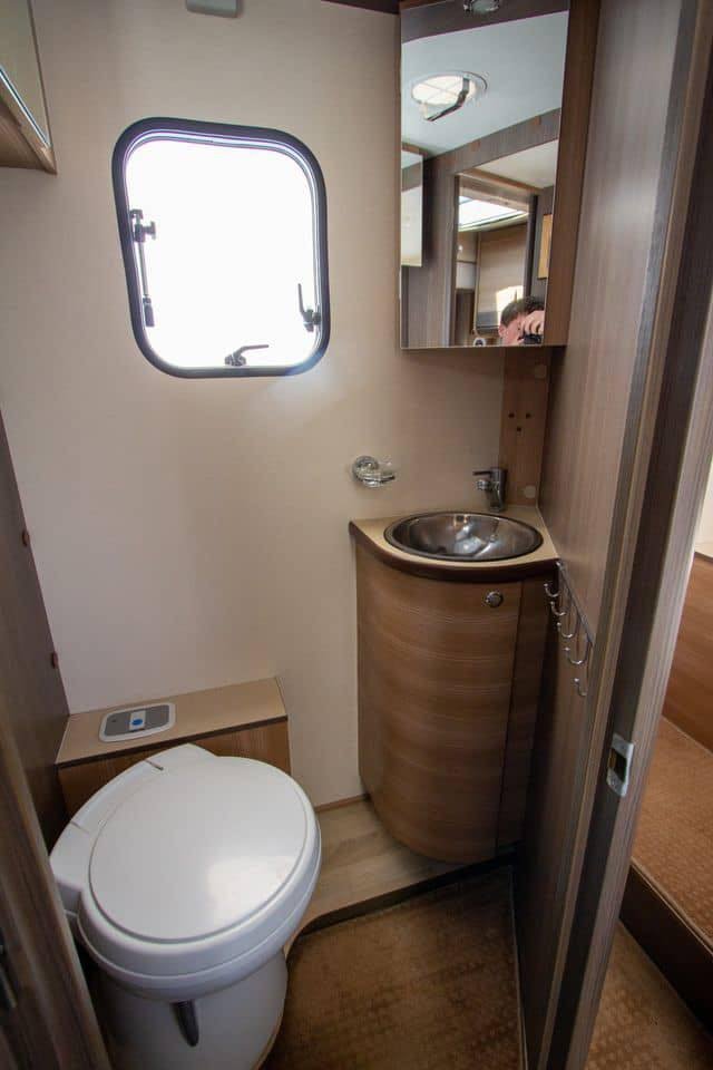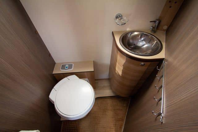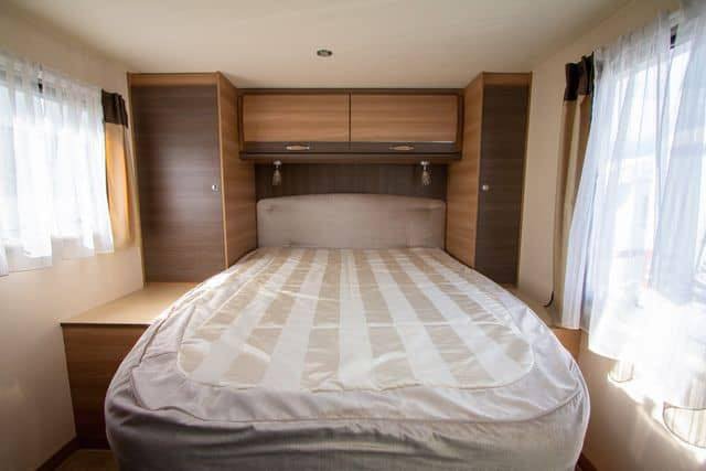 La chambre à coucher se trouve à l’arrière du camping-car, où il y a un grand lit positionné au centre avec accès des deux côtés. Il y a beaucoup d’espace de rangement dans les tiroirs et les placards au-dessus, au-dessous et sur le côté du lit. Il y a une table de chevet de chaque côté du lit.