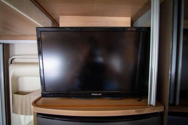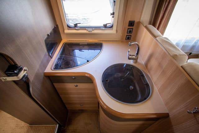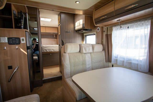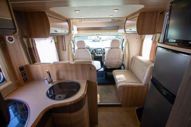 Le salon est grand et spacieux, et le coin salon se compose d’un canapé en L, de sièges latéraux et de fauteuils pilotes pivotants. Au-dessus du compartiment réfrigérateur se trouve un support de télévision et un téléviseur, qui peut être facilement dissimulé si vous le souhaitez. Au-dessus du salon se trouve un lit escamotable pouvant accueillir deux adultes.