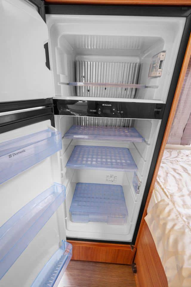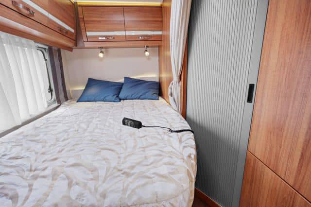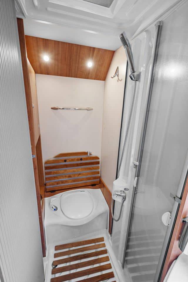 À l’arrière, vous trouverez un lit double latéral unique équipé d’une fonction massage, rare sur ce type de modèle, ainsi qu’une salle de bain avec douche et WC séparés.