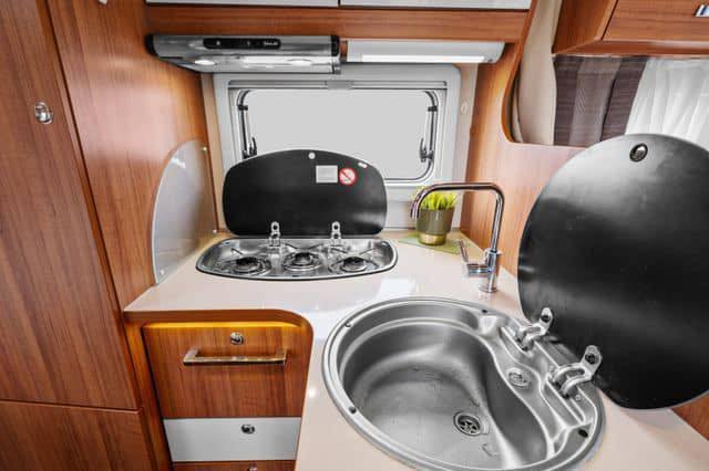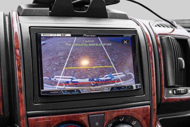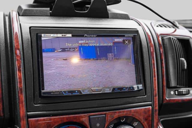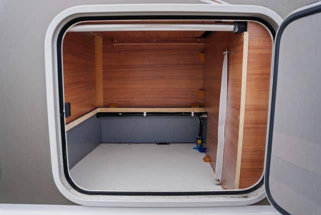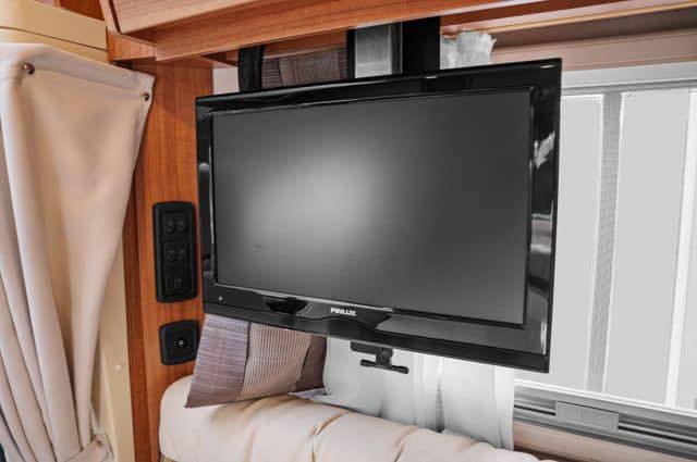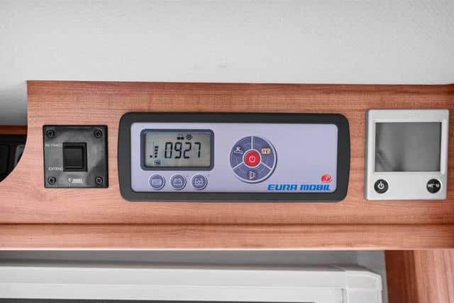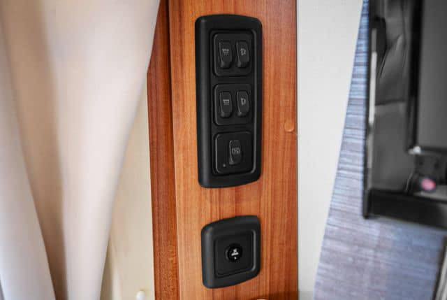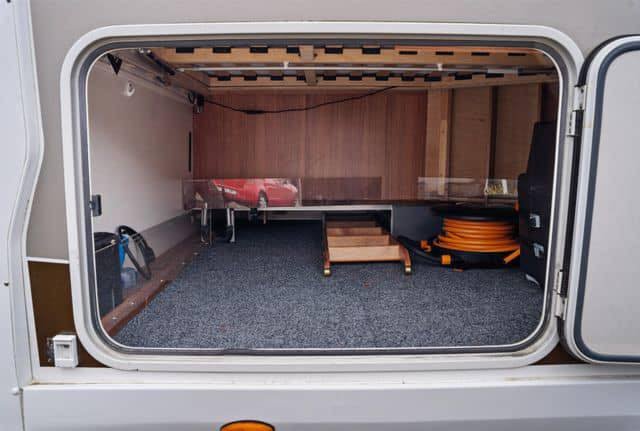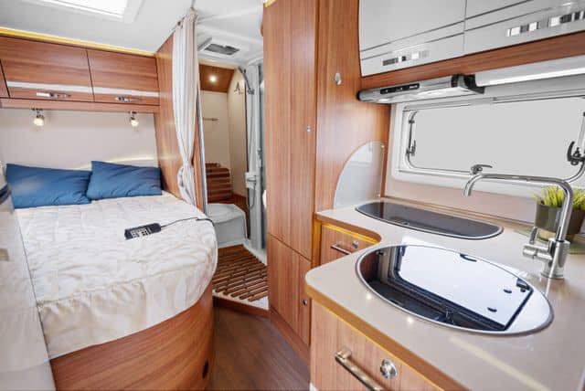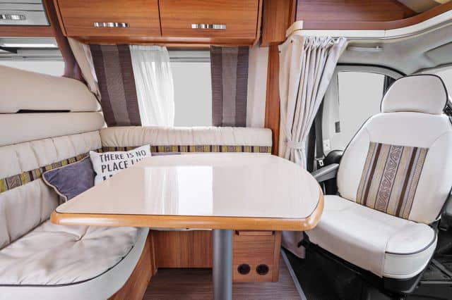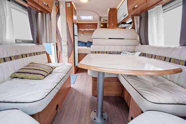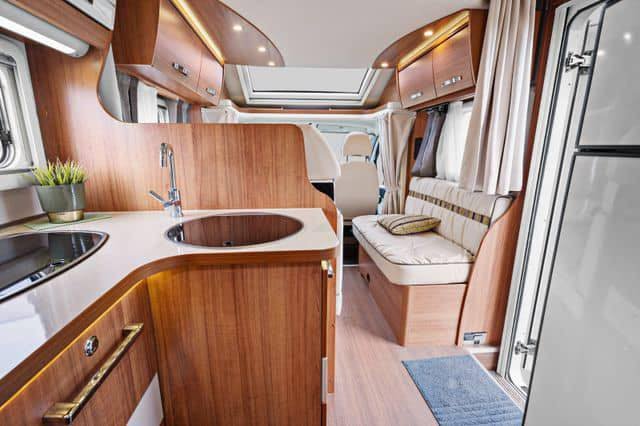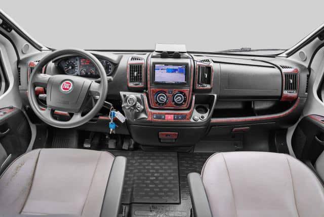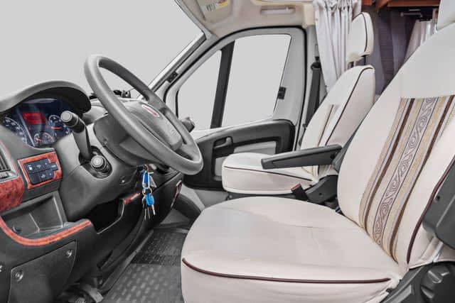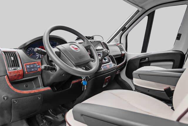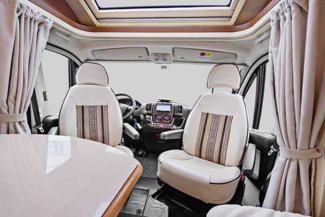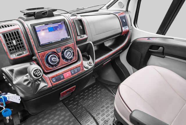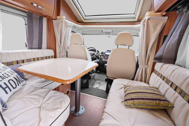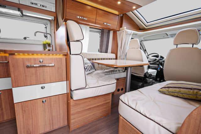 L’intérieur se distingue par son salon spacieux et lumineux, son intérieur cuir clair, son panoramasoltak qui inonde l’habitacle de lumière, et un lit suspendu au-dessus de la dînette.