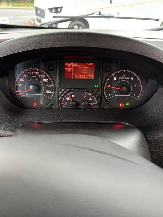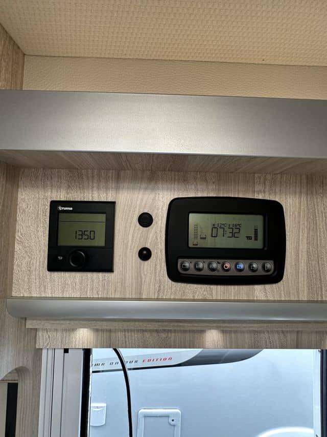 Un tableau de bord clair, une boîte de vitesses automatique et des sièges pivotants dans un beau tissu clair. On y trouve une radio à deux canaux, mais avec un adaptateur Dab à côté qui envoie les signaux par la fréquence FM.