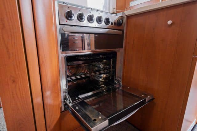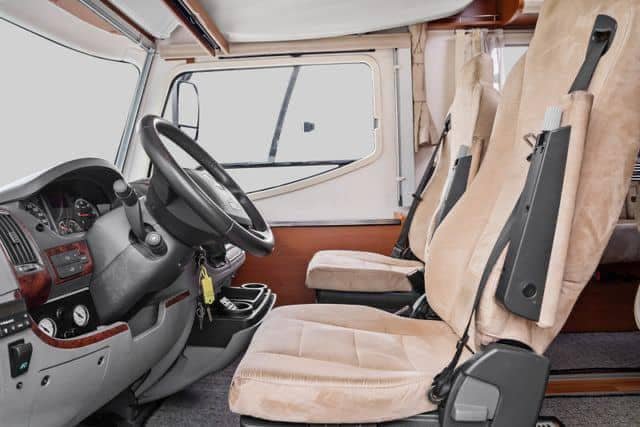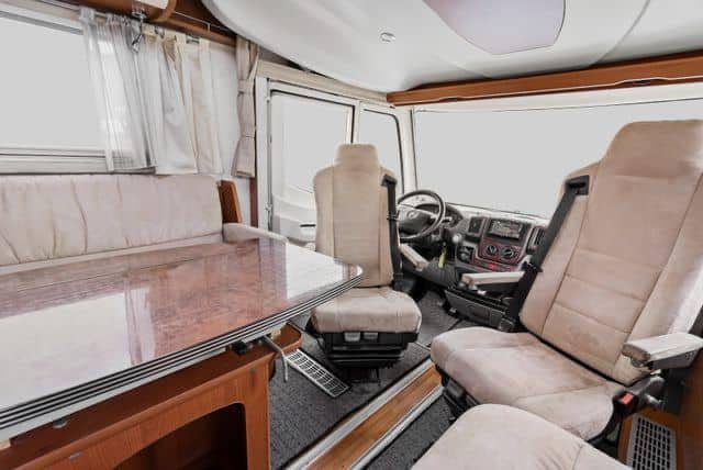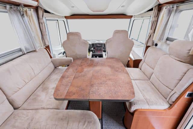 Le salon se compose d’un grand canapé en L, d’une banquette deux places et des deux sièges pilotes pivotants. La grande table permet à toute la famille de s’asseoir autour. La table peut également être rallongée par un disque supplémentaire. Cela signifie que vous pouvez vous amuser à l’intérieur, même les jours de pluie, sans vous sentir à l’étroit dans la voiture. Au-dessus du salon se trouve un grand lit électrique escamotable pouvant accueillir deux adultes. Entre le salon et la cuisine se trouve un placard rabattable où se trouve la télévision.