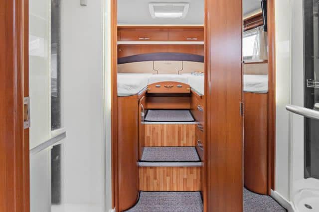 La chambre à coucher est équipée de deux grands lits simples qui peuvent facilement être convertis en un lit double. Des escaliers permettent d’accéder au lit, et sous le lit se trouvent des placards et des tiroirs pouvant accueillir la plupart des bagages. La chambre peut être séparée du reste du camping-car par une porte coulissante.