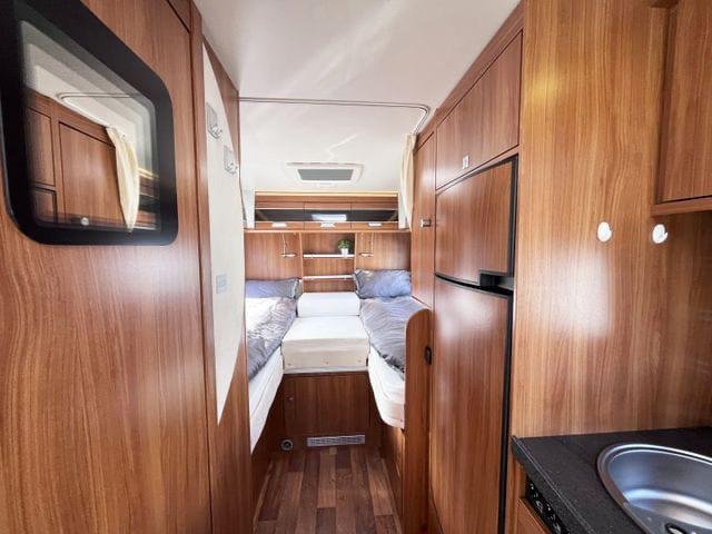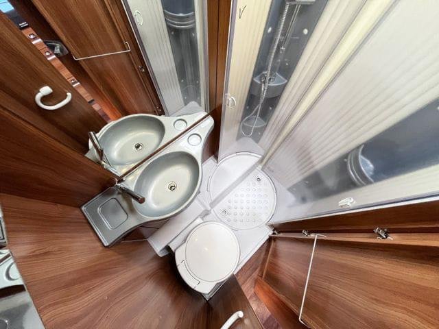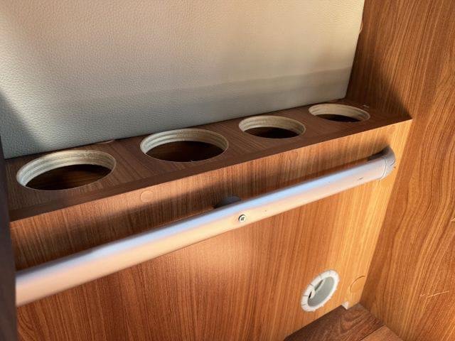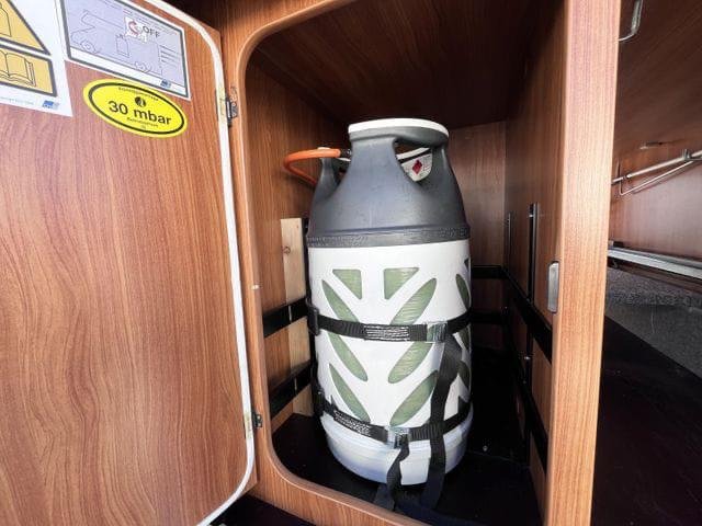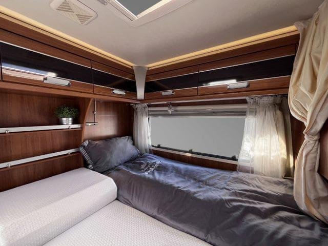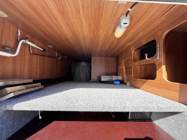 Sous le lit, vous disposez d’un espace de rangement et de nombreux placards ailleurs dans le camping-car.