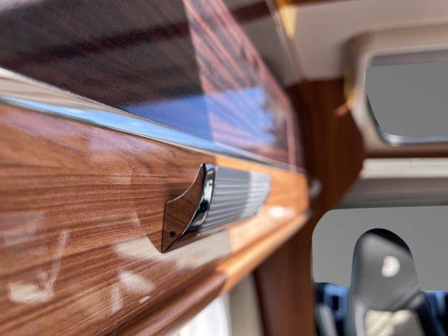 Tous les sièges sont recouverts de cuir, contrastant avec les autres surfaces en bois foncé, ce qui donne une impression générale de confort.