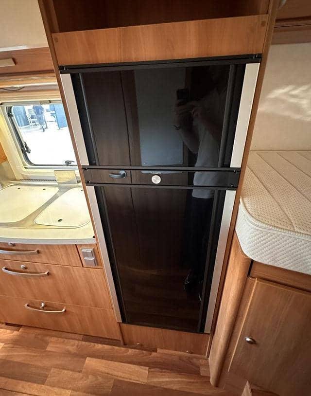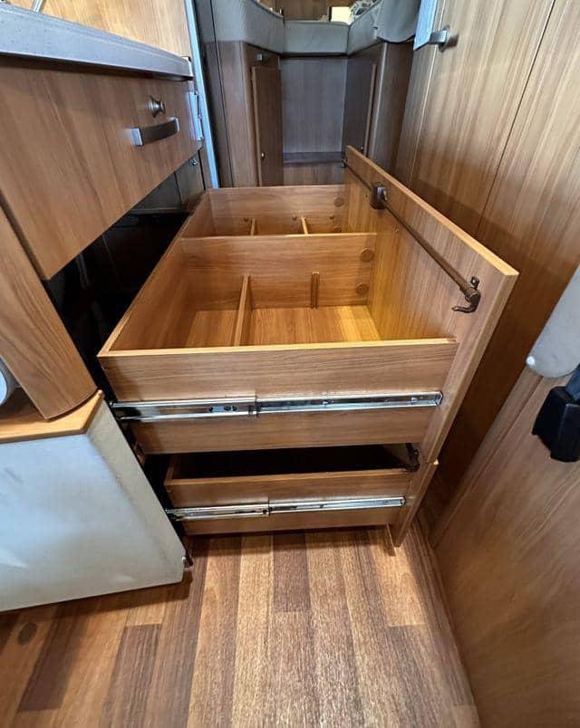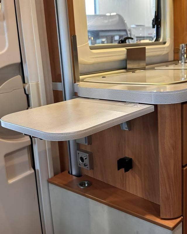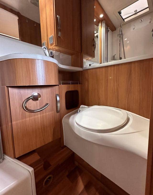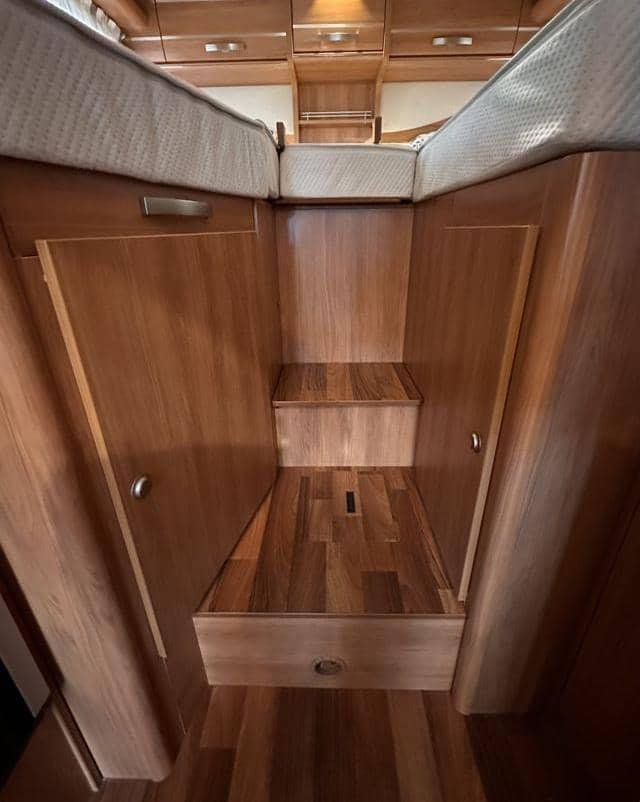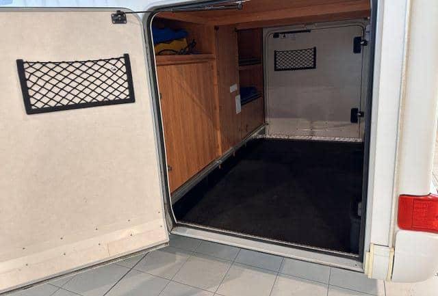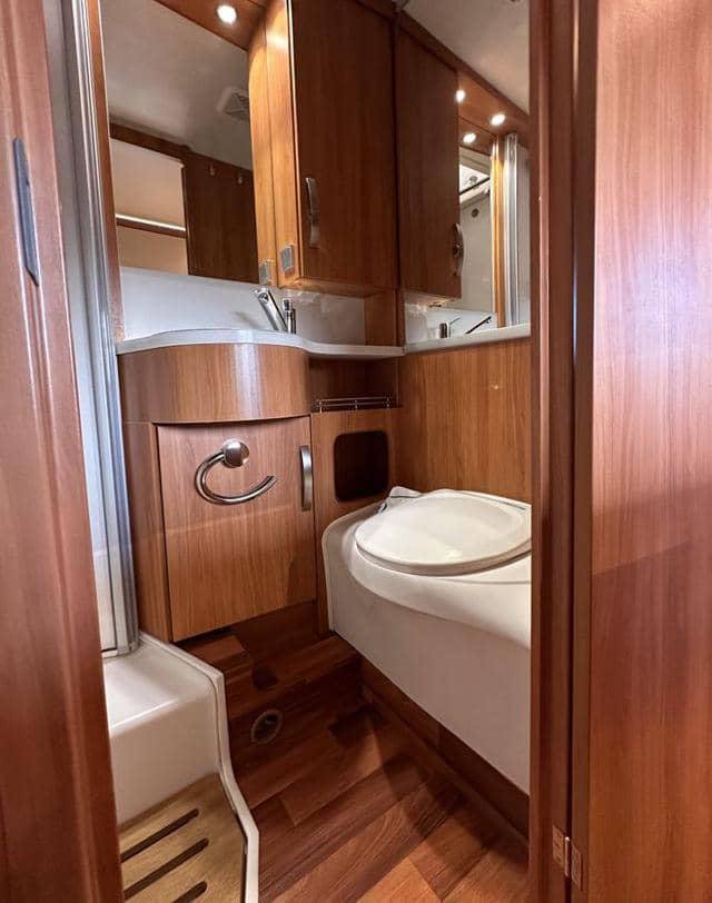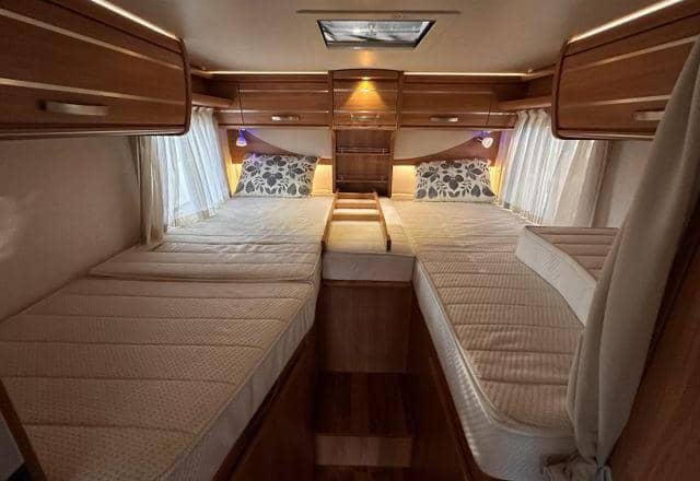 Il s’agit d’une voiture avec deux lits longitudinaux, ce qui donne un grand et bon espace de chargement. Salle de bain spacieuse avec douche. Le modèle est délibérément produit un peu plus étroit (221cm) pour faciliter l’accessibilité.