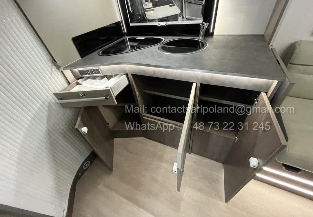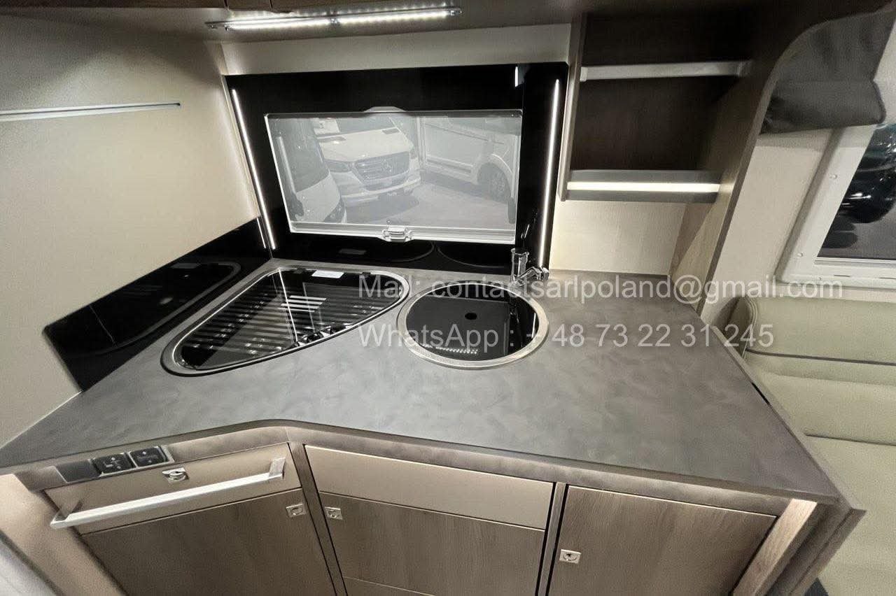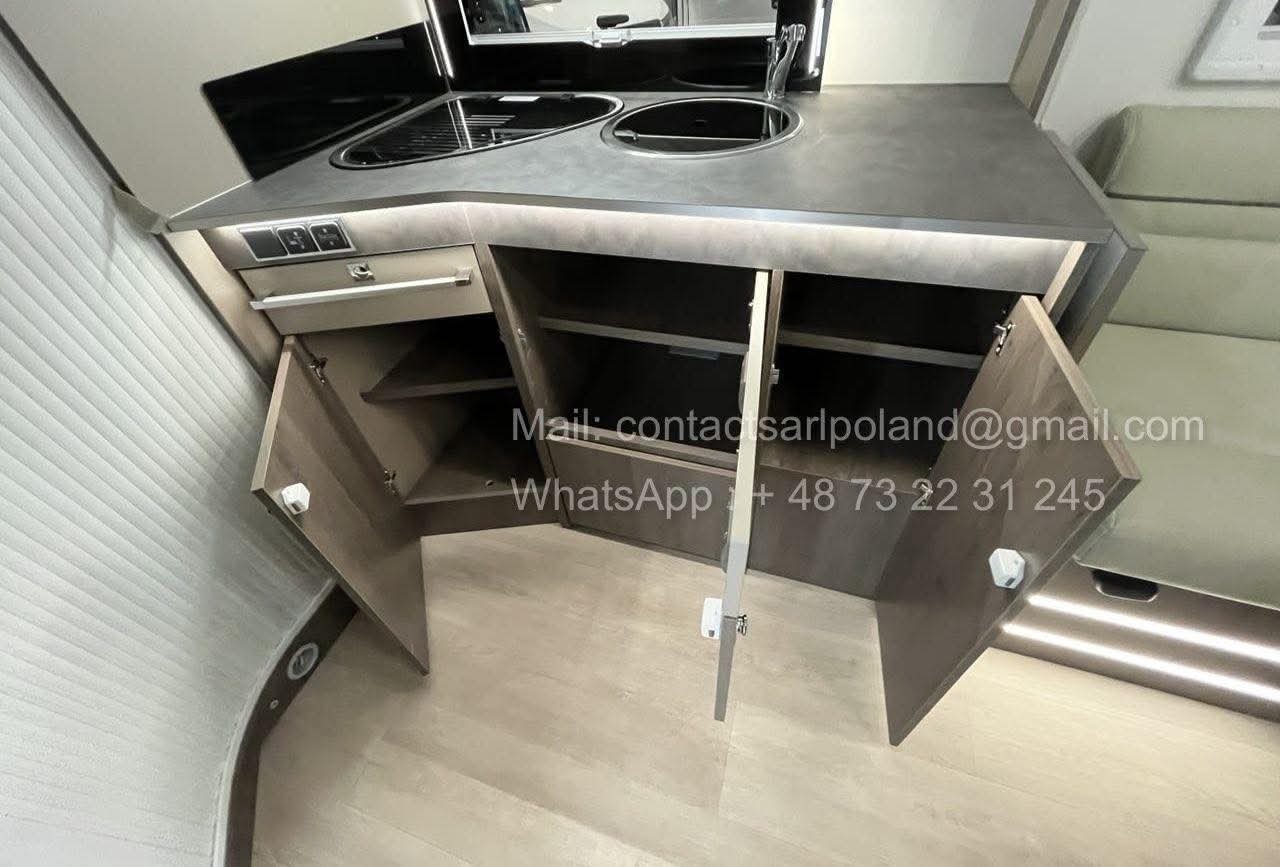 À l’arrière, le vaste cabinet de toilette occupe toute la largeur du véhicule, garantissant confort et intimité.