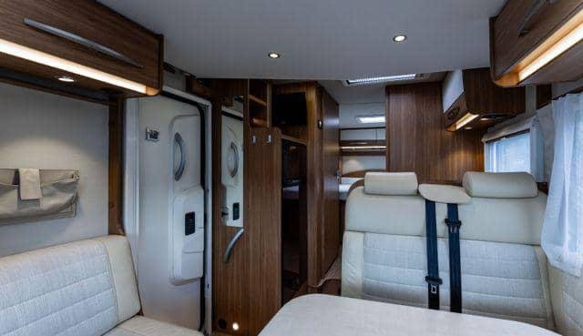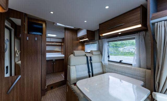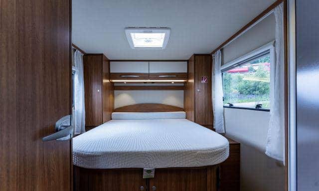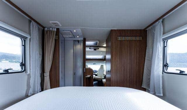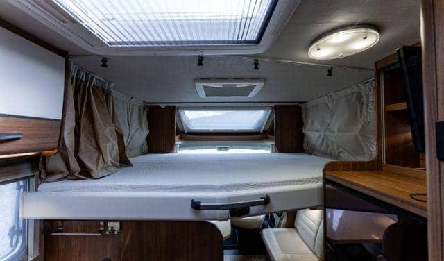 Lit double central à l’arrière du camping-car. Lit escamotable qui s’abaisse au-dessus de la table basse.