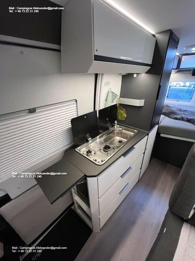 La voiture est équipée d’un espace couchage spacieux, d’une cuisine moderne et d’une élégante salle de bain avec douche, ce qui en fait un choix idéal aussi bien pour les courts trajets du week-end que pour les aventures plus longues. Son moteur puissant et son format pratique le rendent facile à manœuvrer, même dans les rues étroites de la ville ou sur les routes de campagne étroites.