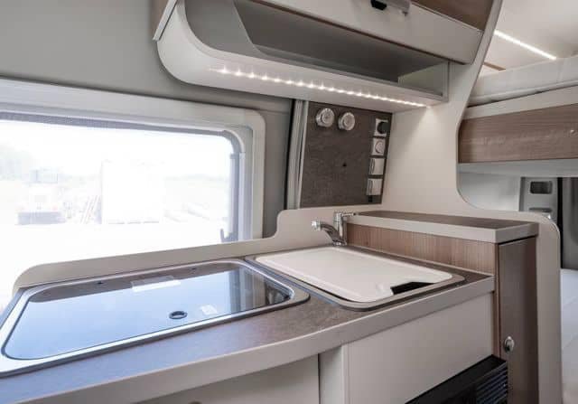 La cuisine est compacte mais offre suffisamment d’espace pour ranger les ustensiles de cuisine. Elle est équipée de deux plaques de cuisson et d’un évier pratique, ce qui permet de cuisiner facilement et efficacement. Un réfrigérateur-congélateur Dometic en bois est élégamment placé sous l’évier, et les profonds tiroirs en bois et en blanc offrent suffisamment d’espace pour ranger tout ce dont vous avez besoin. Les détails argentés ajoutent une touche de modernité, tandis que le long meuble peut accueillir deux poubelles allongées qui facilitent le tri des déchets. Cette cuisine est superbe dans ce camping-car urbain.
