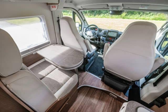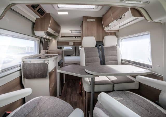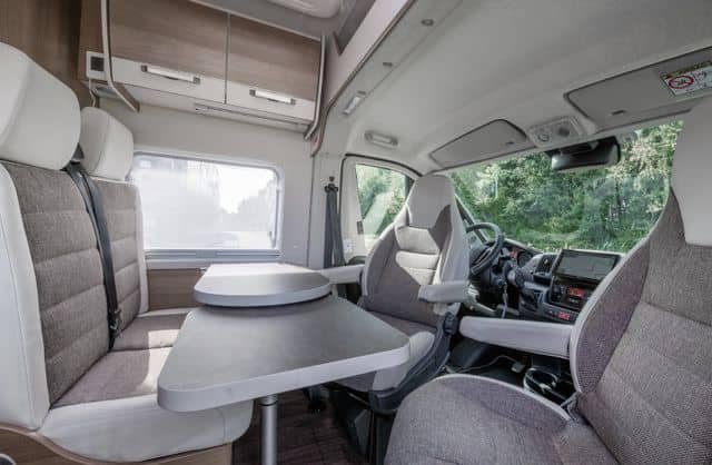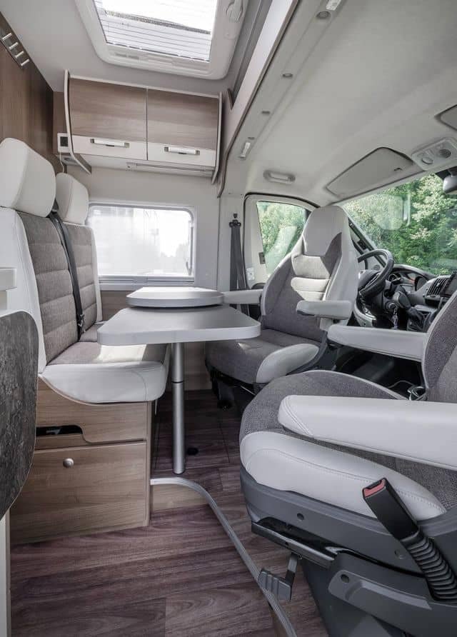 A l’intérieur, le camping-car City offre un bel habitacle avec des sièges en cuir blanc pour un grand confort d’assise. Les textures grises et brunes ajoutent une touche agréable qui rend le camping-car à la fois confortable et accueillant. Le plancher en bois chaud procure une sensation de confort sous les pieds et, avec les autres détails, crée une atmosphère chaleureuse et accueillante.