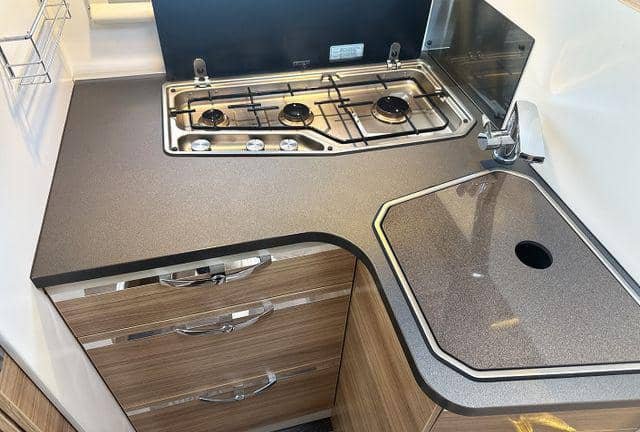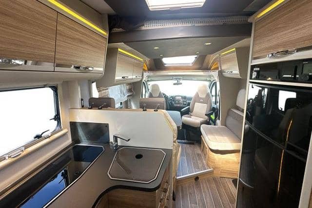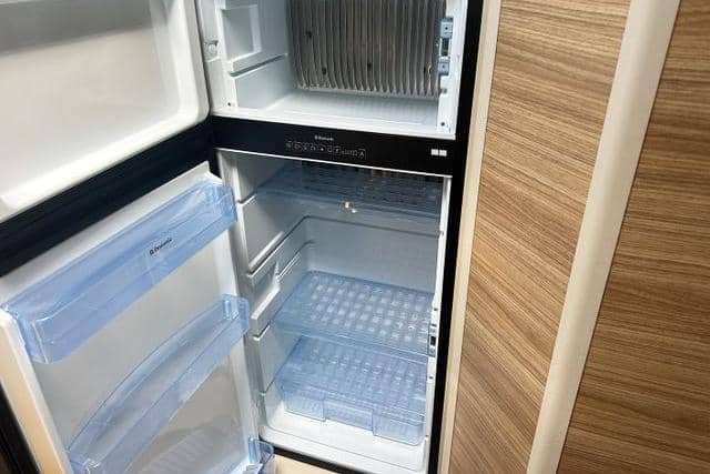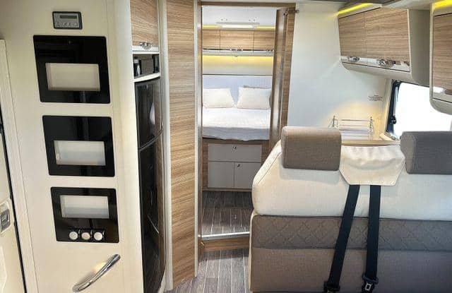 A l’intérieur du camping-car, vous trouverez un coin salon spacieux et confortable, parfait pour s’amuser en famille ou passer un moment tranquille avec un bon livre. La cuisine pratique est bien équipée avec des plaques de cuisson au gaz et un grand réfrigérateur avec un congélateur séparé qui peut fonctionner au gaz, sur batterie ou en 230V. Vous pouvez ainsi préparer de délicieux repas où que vous soyez.