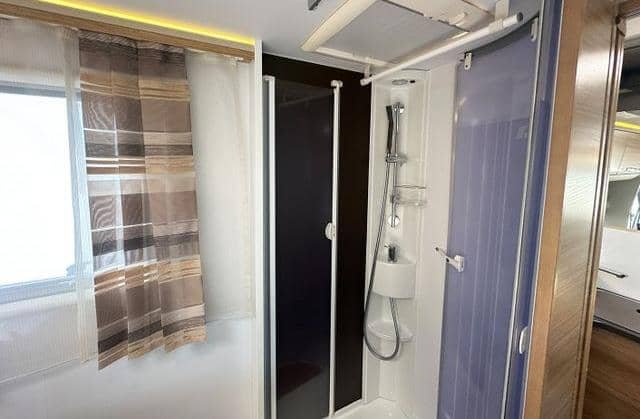 L’un des grands avantages de ce modèle est le luxueux lit double à l’arrière, qui est un « grand lit ». Il est positionné de manière à ce que vous puissiez facilement entrer et sortir des deux côtés, et avec une porte coulissante dans la chambre à coucher, vous obtenez un sentiment d’intimité et de séparation du reste du camping-car. En outre, il y a un lit double escamotable au-dessus du coin salon et la possibilité de convertir le coin salon en cinquième couchette.