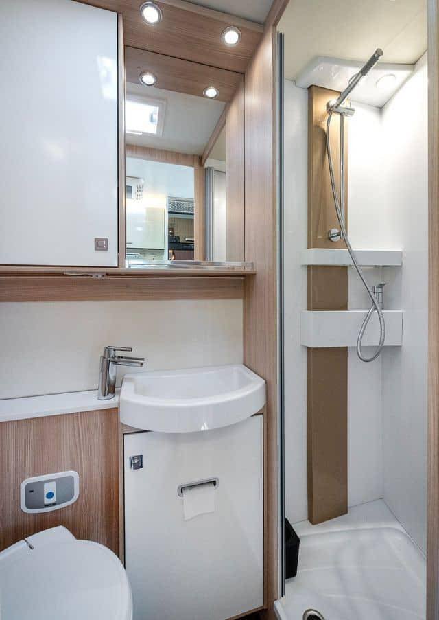 La salle de bains est à la fois spacieuse et moderne, et se distingue comme l’une des plus spacieuses sur le marché des camping-cars. La grande porte de la salle de bains permet un accès facile et vous trouverez à l’intérieur de nombreux placards de rangement. Le grand miroir donne une impression d’espace encore plus grande, tandis que le robinet moderne ajoute une touche luxueuse. Avec son design généreux et ses détails bien pensés, la salle de bains vous offre une expérience confortable et agréable.