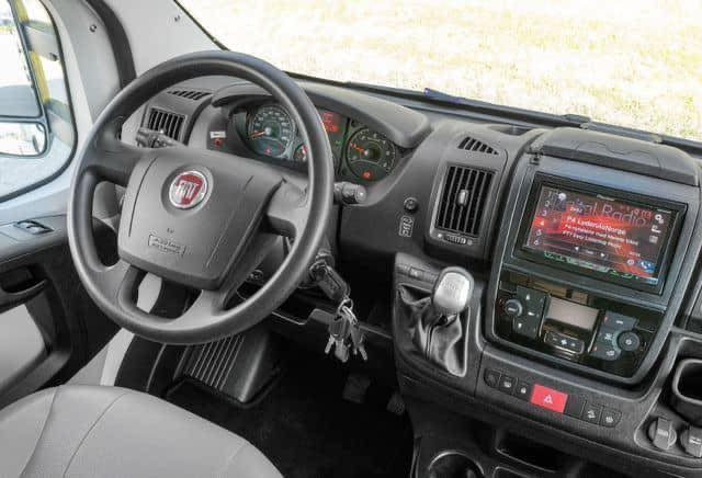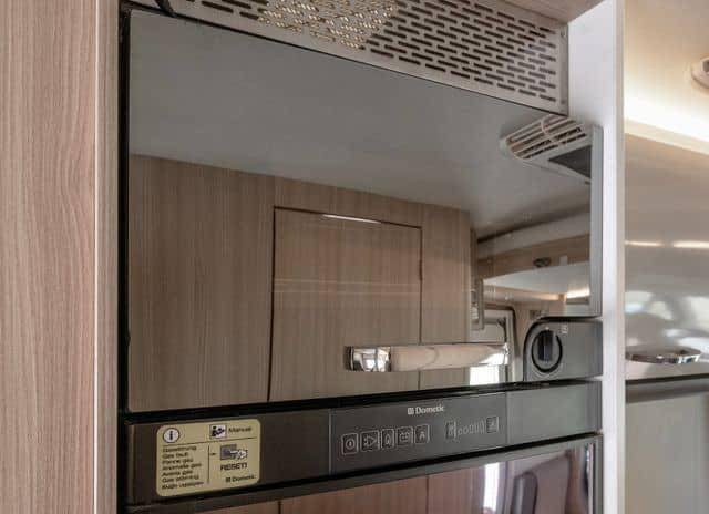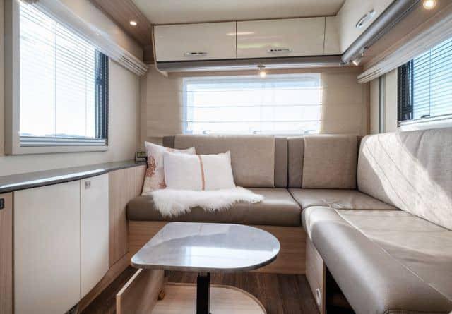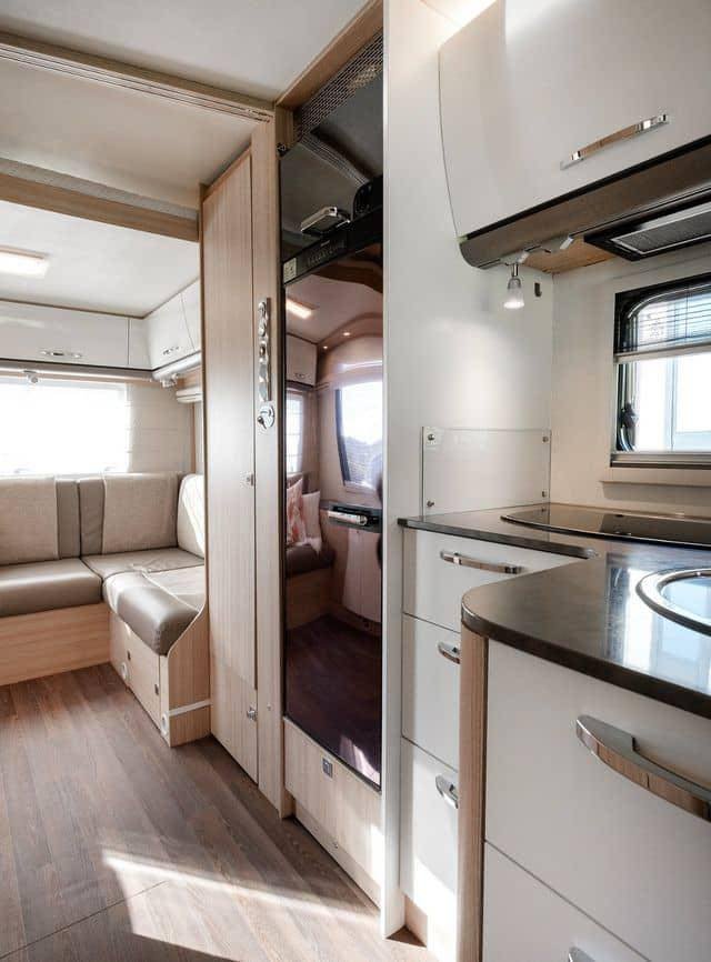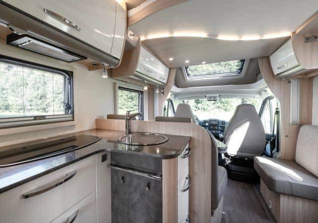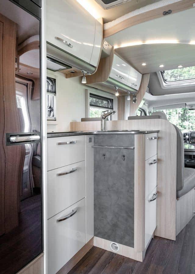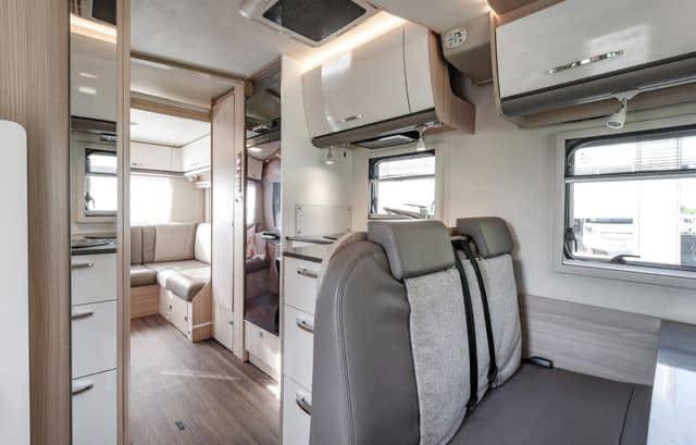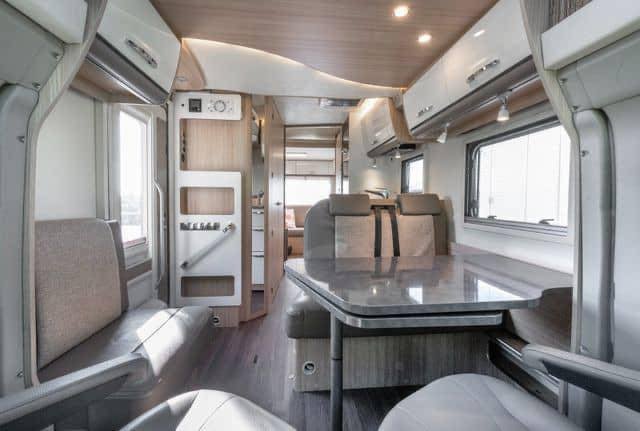 Lorsque vous entrez dans le camping-car, vous êtes accueilli par une atmosphère ouverte et lumineuse. Les sièges en cuir beige-brun combinés à des tissus clairs créent une atmosphère accueillante et moderne. Les étagères et les tiroirs blancs avec des détails argentés, ainsi que les élégantes boiseries, ajoutent une touche sophistiquée. Le groupe de salle à manger pratique, qui peut être rallongé, et l’éclairage d’ambiance confortable vous permettent de vous détendre et de profiter de chaque instant. Il y a également de nombreux espaces de rangement au-dessus des sièges du conducteur et un miroir allongé à l’entrée qui renforce la sensation d’espace.