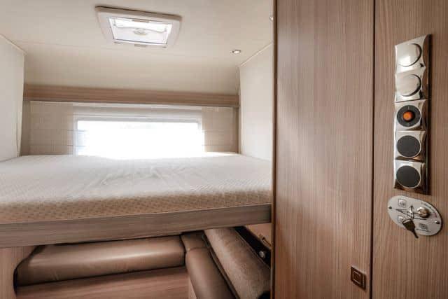 Ce camping-car offre une solution de couchage flexible. Le lit double peut être élégamment abaissé au-dessus de la salle à manger. Pour plus de confort, un lit double supplémentaire peut être abaissé au-dessus du salon TV séparé à l’arrière, sur simple pression d’un bouton. Un escalier pratique permet d’accéder facilement au lit, ce qui vous permet de personnaliser l’espace en fonction de vos besoins, que vous voyagiez en couple ou en famille.