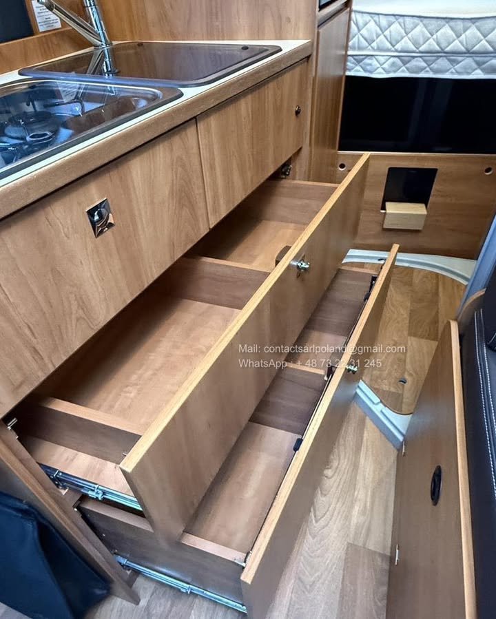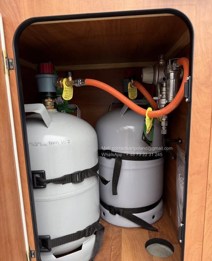 À bord, on retrouve une ambiance haut de gamme avec de véritables sièges en cuir, une excellente isolation, un chauffage puissant Truma Combi 6E fonctionnant au gaz et à l’électricité, ainsi qu’une climatisation de toit Freshjet 2000 pour un confort optimal en toute saison.
