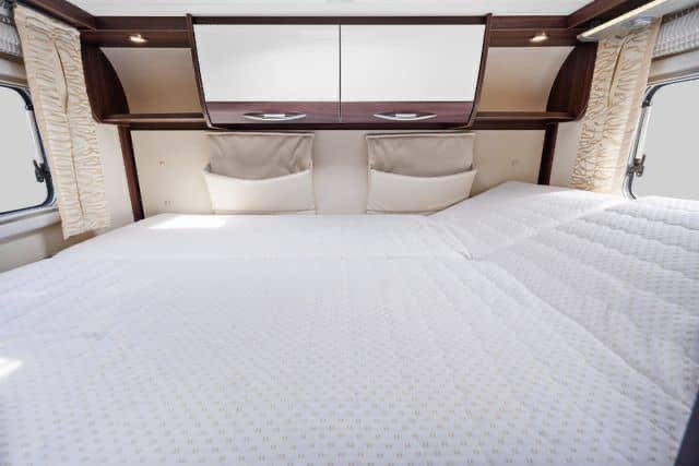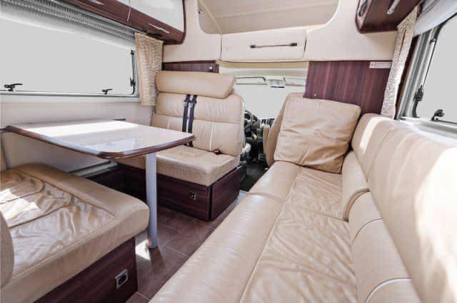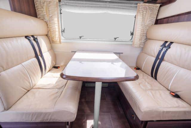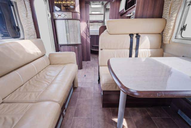 Grand salon en cuir spacieux avec de la place pour toute la famille autour de la table. Grand lit double à l’arrière du camping-car avec possibilité de le refermer.