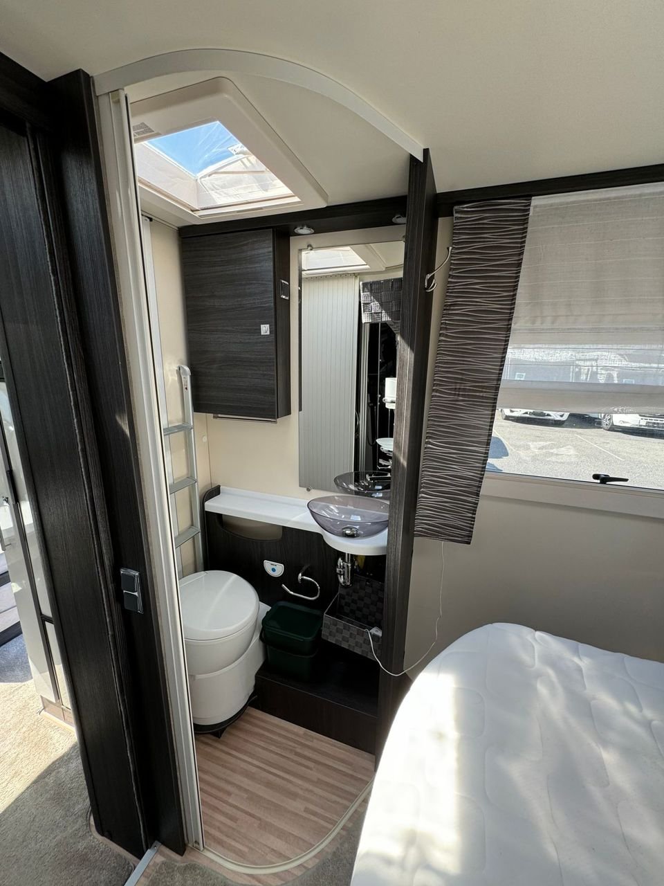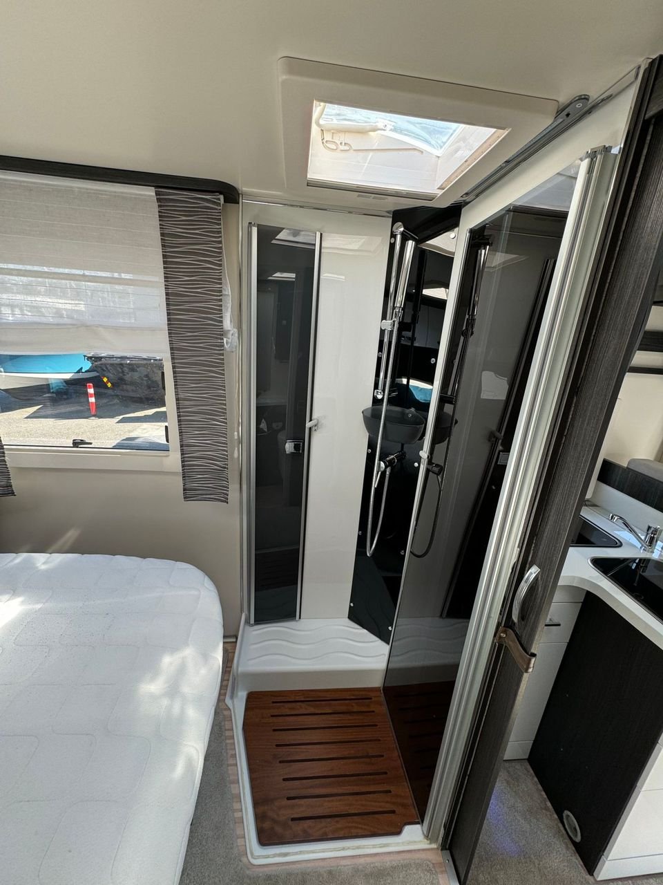 A l’arrière de la voiture, il y a un grand lit, des toilettes et une douche séparées avec leur propre cabine de douche.