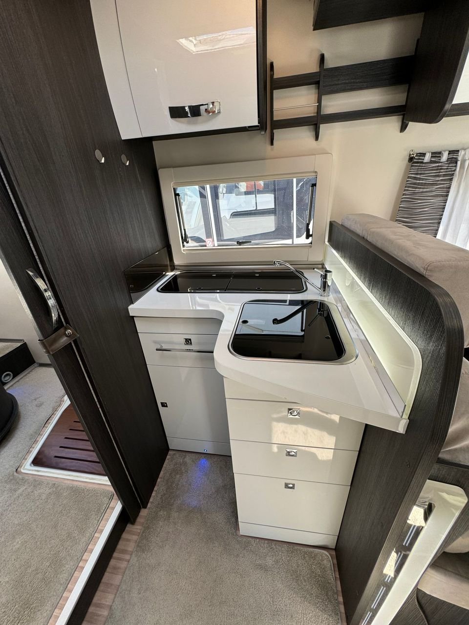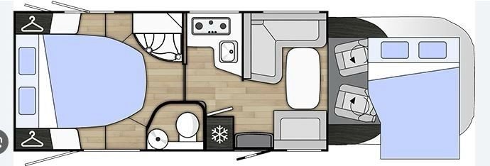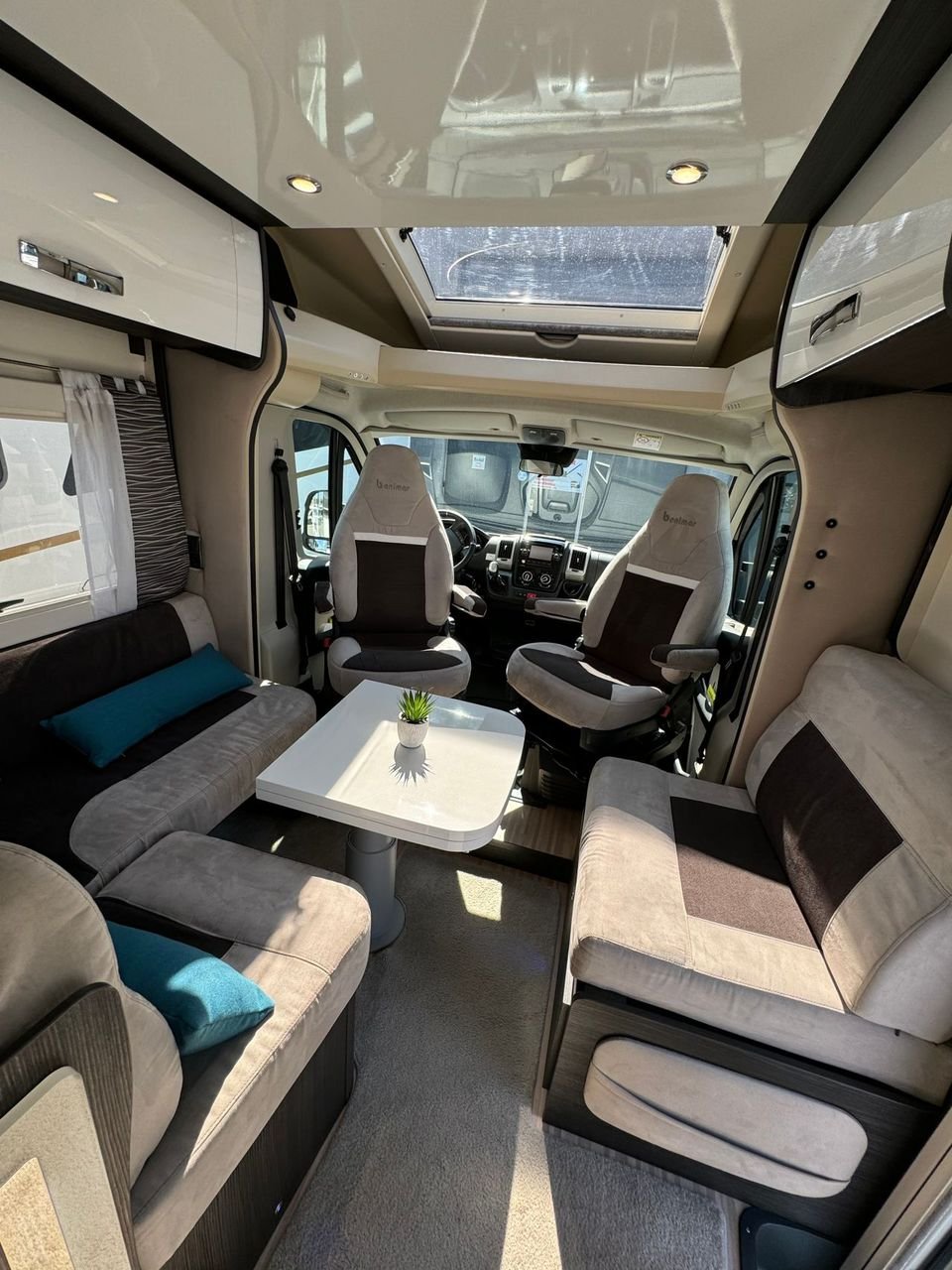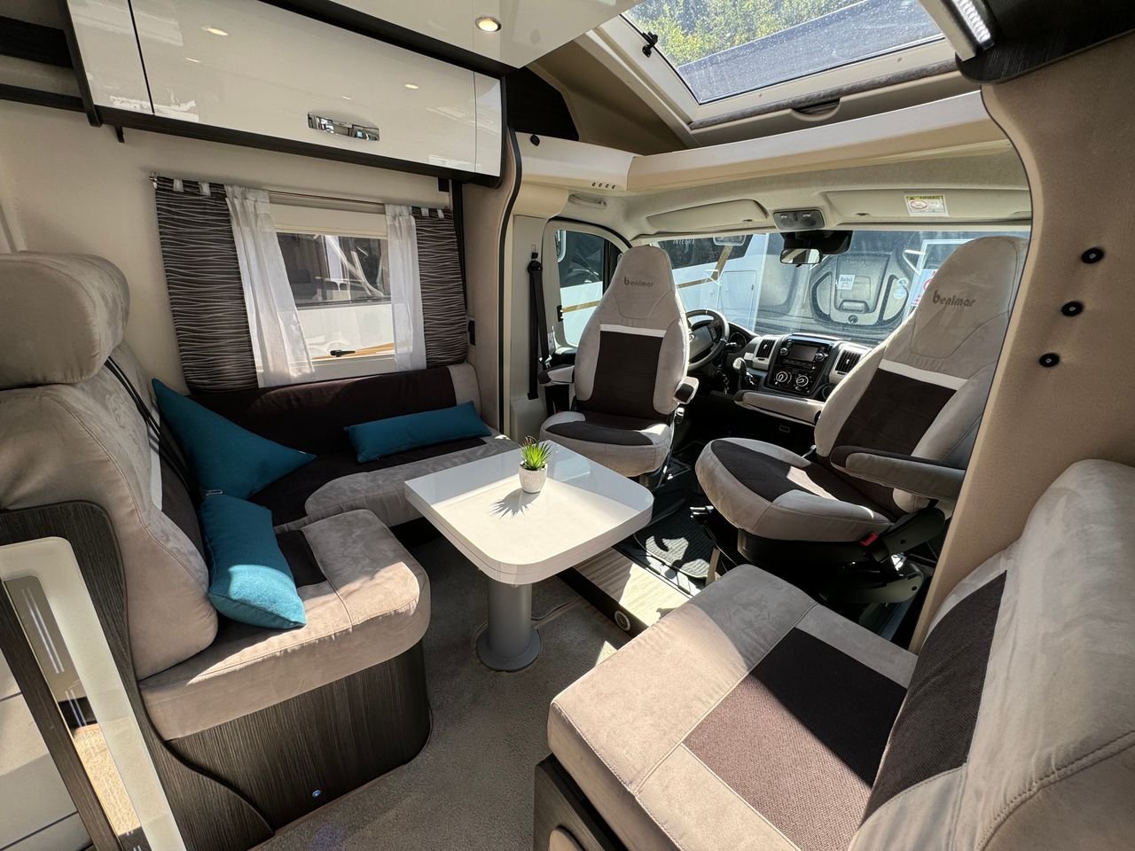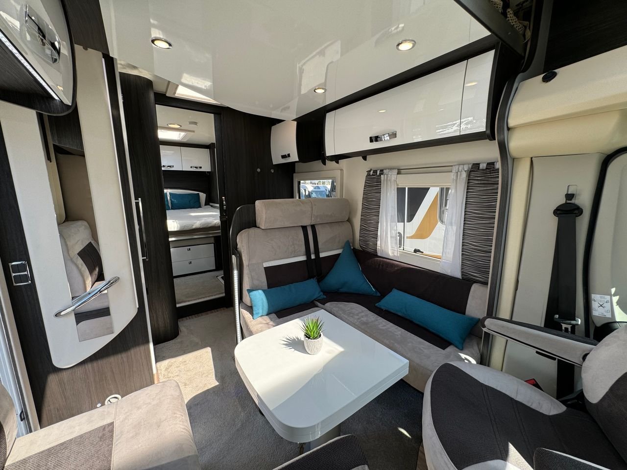 A l’avant, vous avez un salon très spacieux avec un coin salon en forme de L, où vous avez également la possibilité d’abaisser le lit d’appoint au-dessus de la table basse.