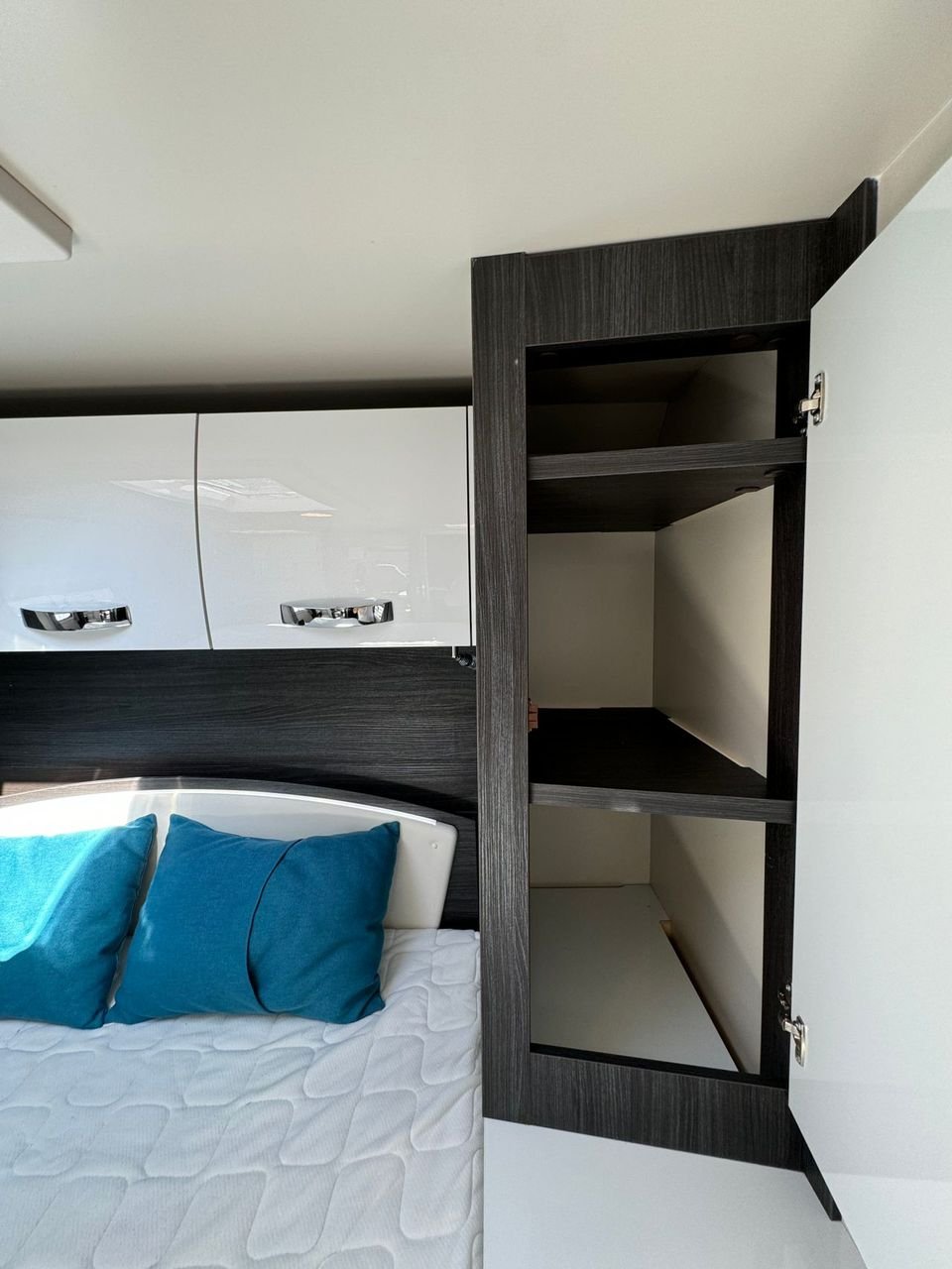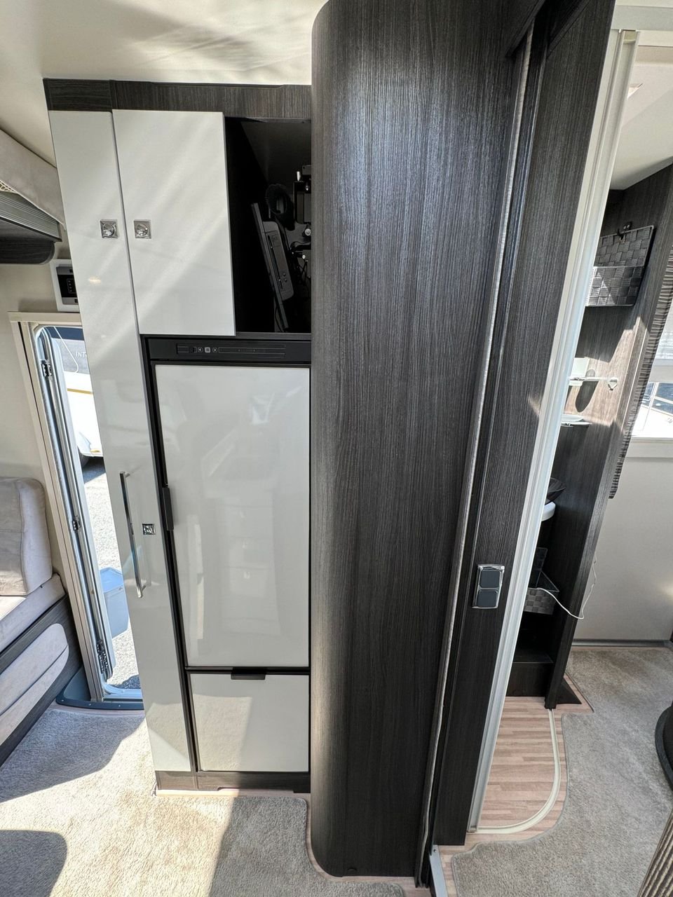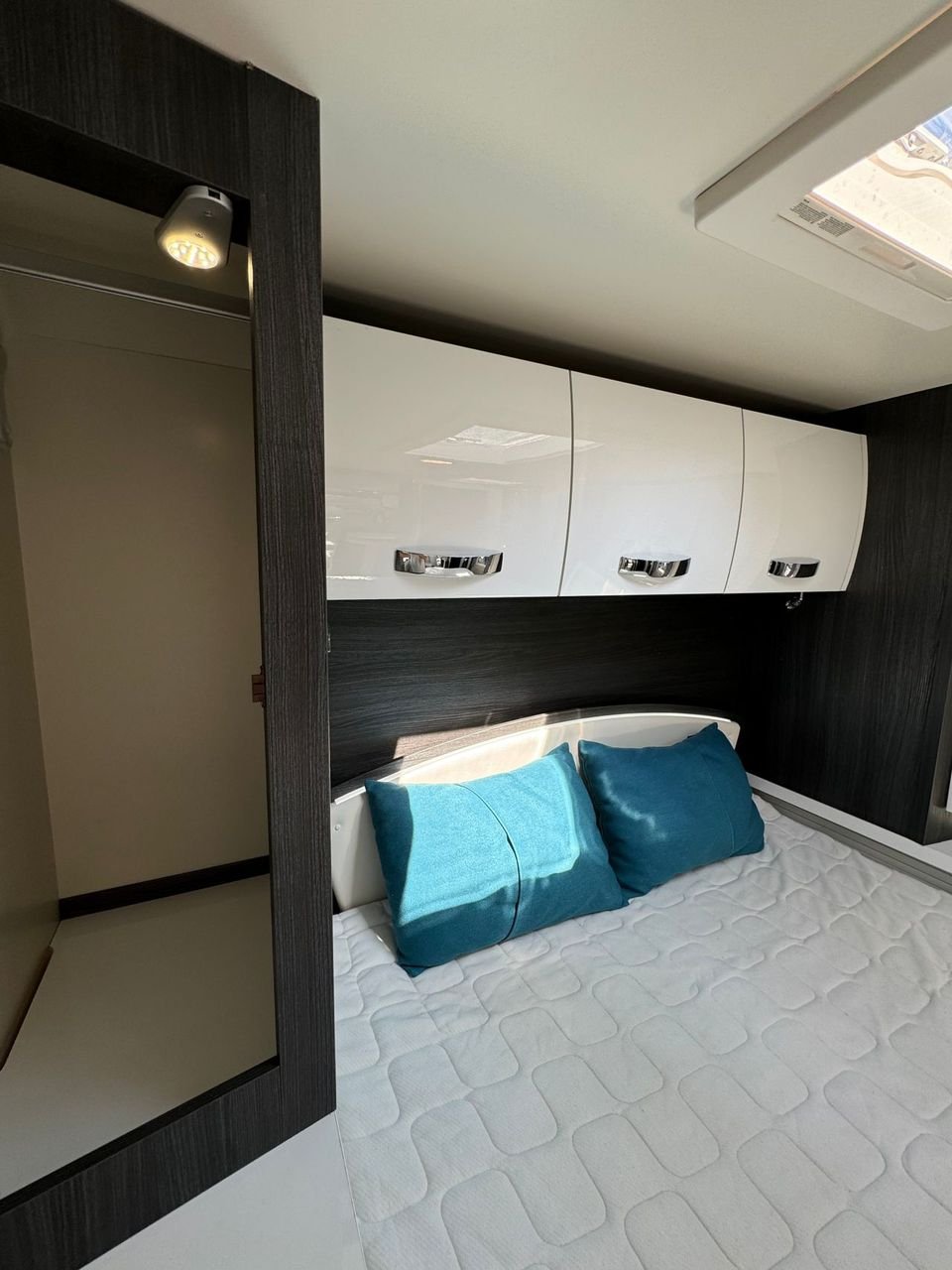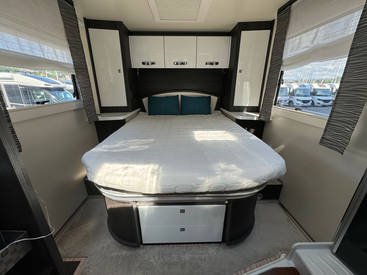 A l’avant, vous avez un salon très spacieux avec un coin salon en forme de L, où vous avez également la possibilité d’abaisser le lit d’appoint au-dessus de la table basse.