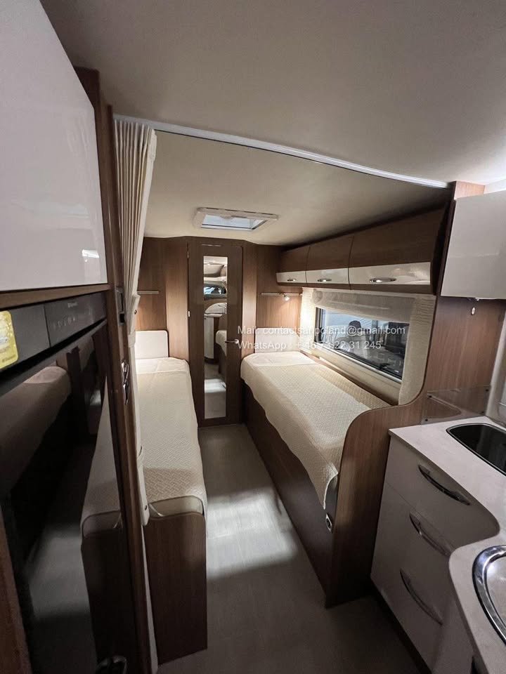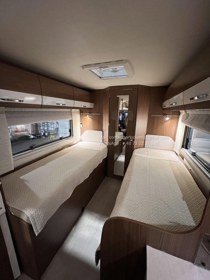 Ce modèle propose une configuration très recherchée avec deux lits jumeaux à l’arrière et une salle de bain spacieuse sur la paroi arrière.
