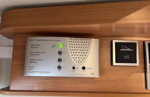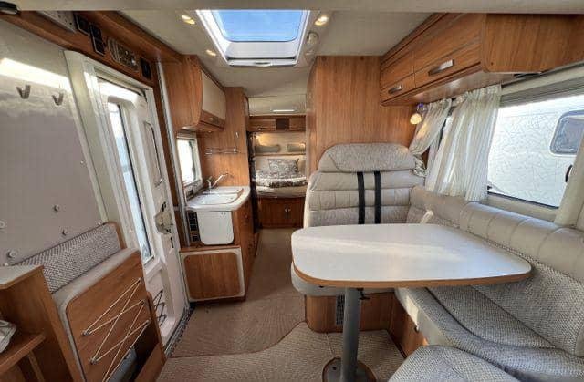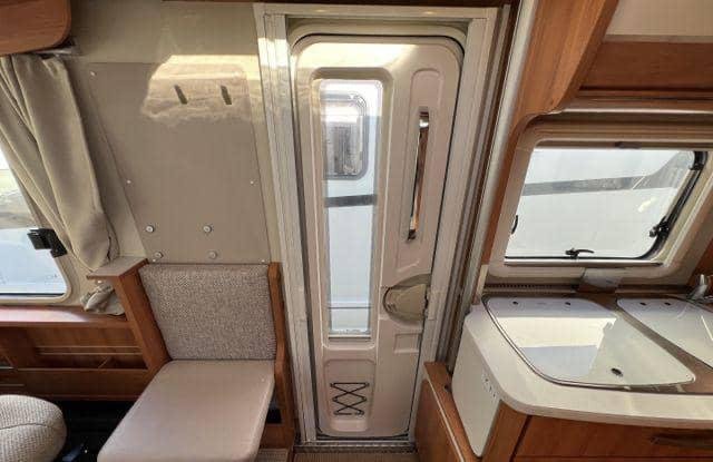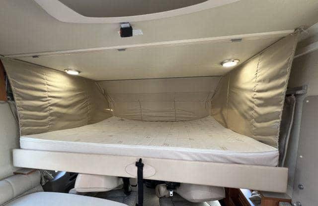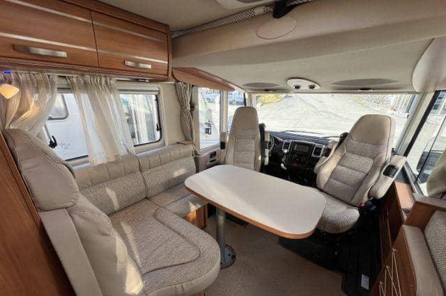 Le salon est ouvert et attrayant avec ses tissus clairs. Il est facile de se croiser pendant les séjours et la table peut être poussée/déplacée selon les besoins. Il y a également un siège supplémentaire qui peut être plié et retiré lorsqu’il n’est pas utilisé. Il peut également servir de repose-pieds pour le passager.