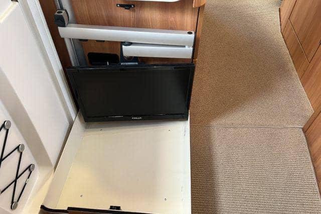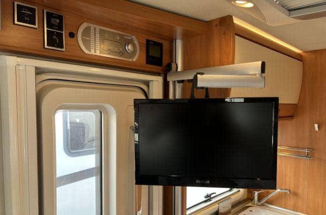 Cette superbe édition Hymer a vraiment tout ce qu’il faut pour voyager confortablement. Il y a un lit double de bonne taille à l’arrière, que l’on peut repousser pendant la journée pour avoir plus de place, ou un lit vertical à l’arrière pour la lecture et d’autres moments de détente.