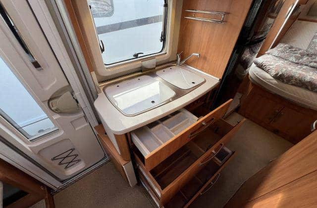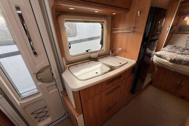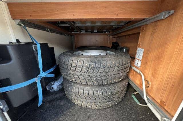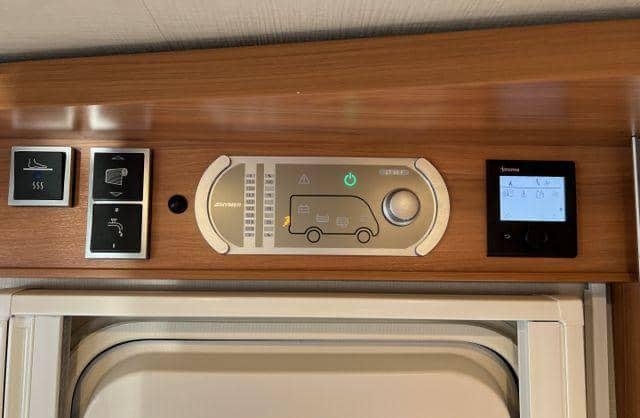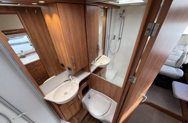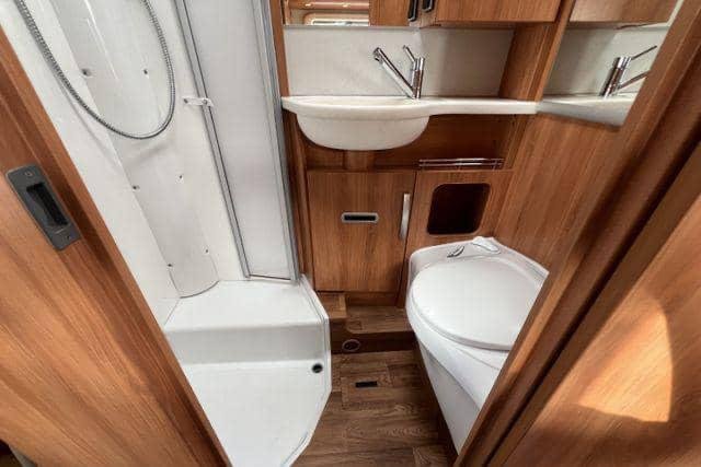 Les toilettes disposent d’un bac à douche séparé avec des parois légères qui peuvent être fermées pour la douche. La salle de bains entre dans la catégorie des salles de bains compactes, avec les toilettes et la douche dans la même pièce. C’est très pratique lorsqu’elle est équipée d’un bac à douche, et cela permet de gagner beaucoup d’espace dans la voiture, que l’on peut utiliser pour d’autres choses.