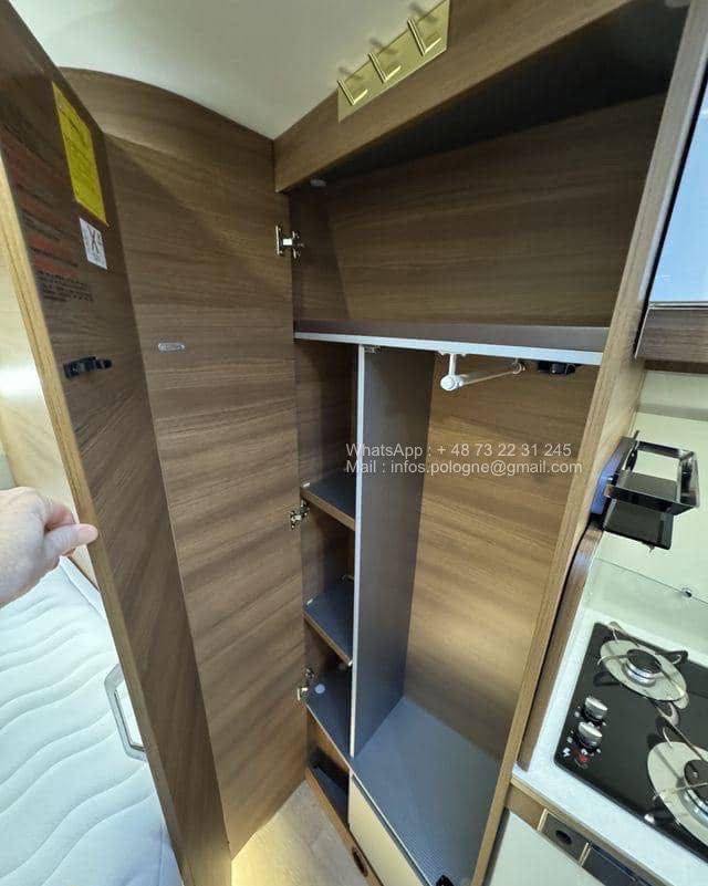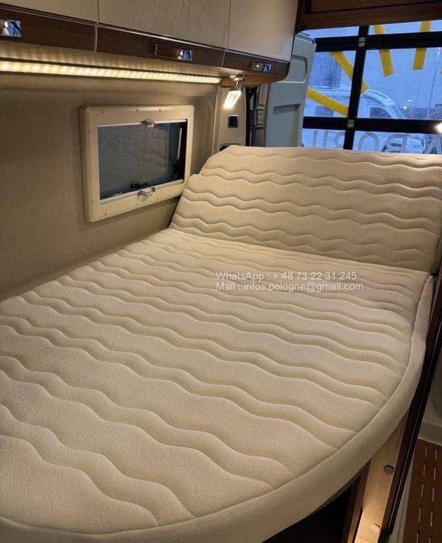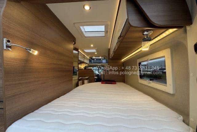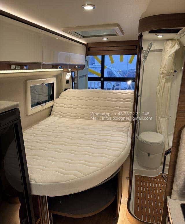 • Chambre : lit transversal arrière avec partie relevable pour accès au garage, matelas confort, placards hauts, trappes de rangement.