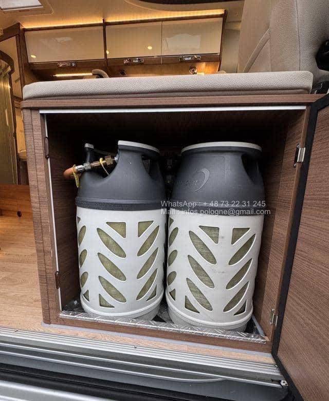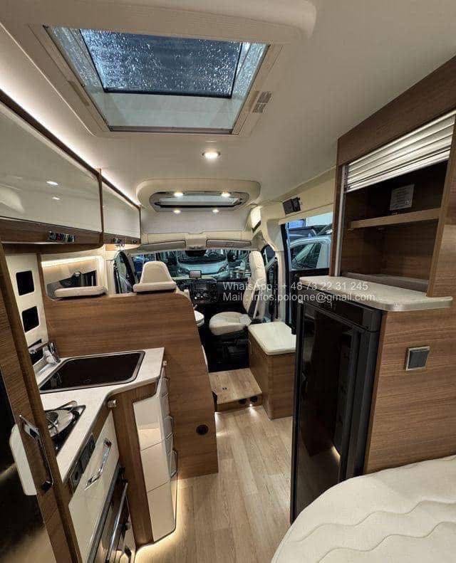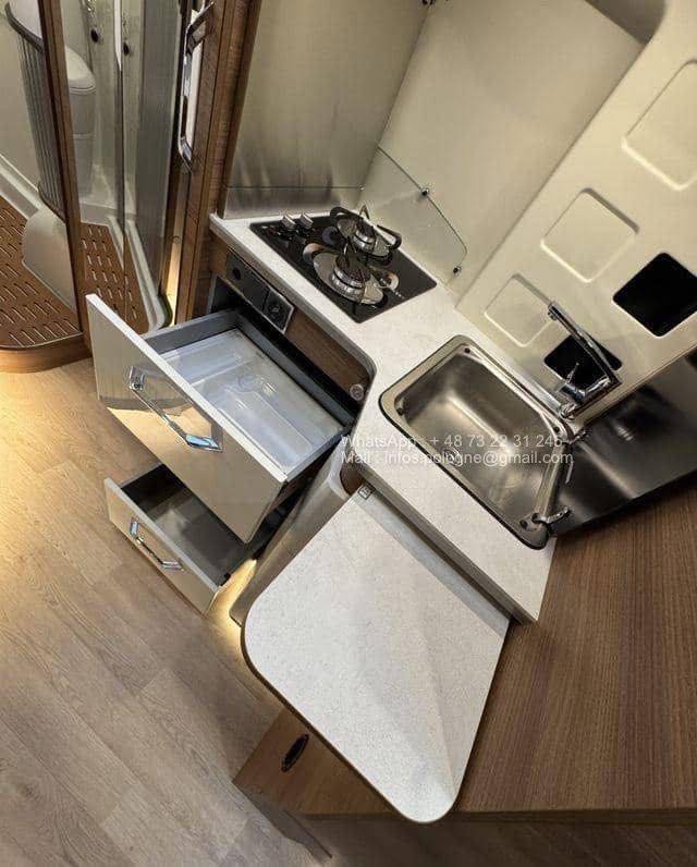 • Cuisine : plan en angle pour plus d’ergonomie, 2 feux gaz, grand évier, nombreux rangements avec fermetures à verrouillage électrique, four à gaz, réfrigérateur 138 L (12V / gaz / 230V).