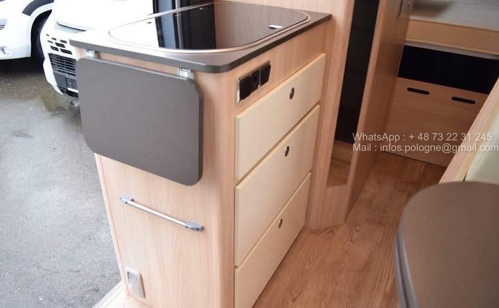 • Cuisine fonctionnelle avec grand réfrigérateur combiné 142 L (12V/230V/Gaz), idéal pour le voyage libre