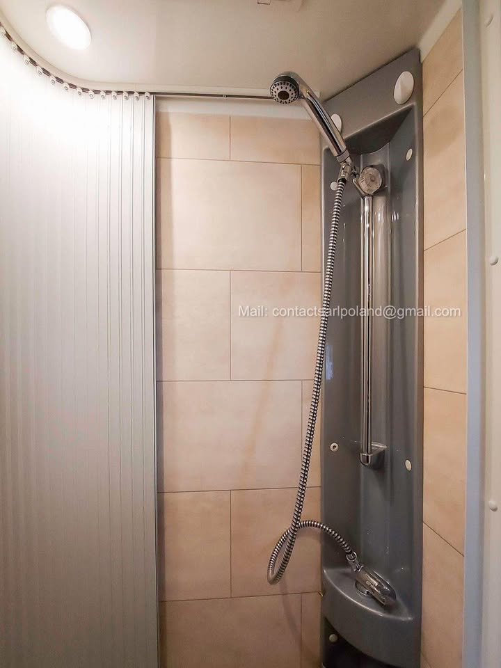 Toilettes fixes, douche séparée et rangements fonctionnels. Espace propre et bien pensé.
